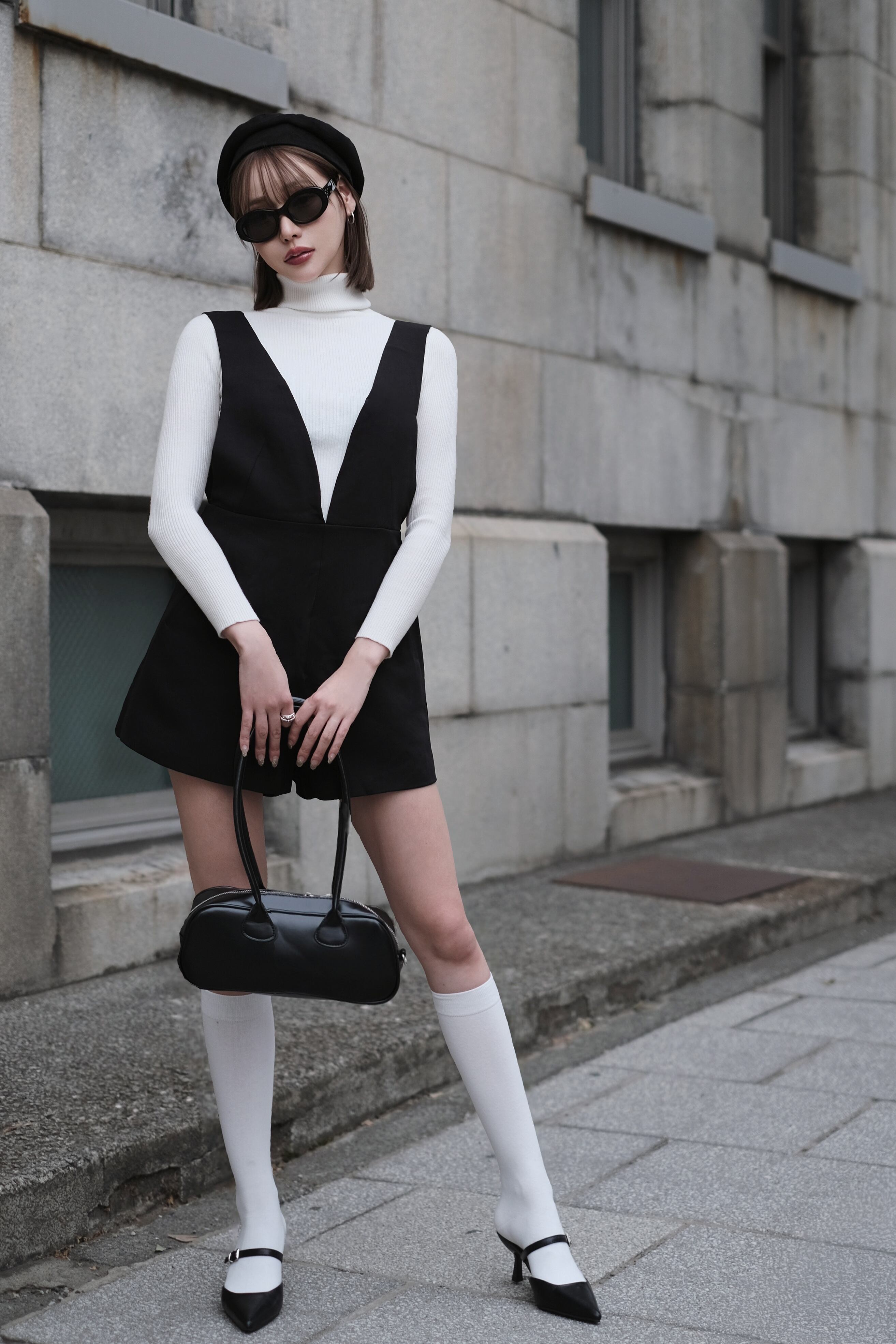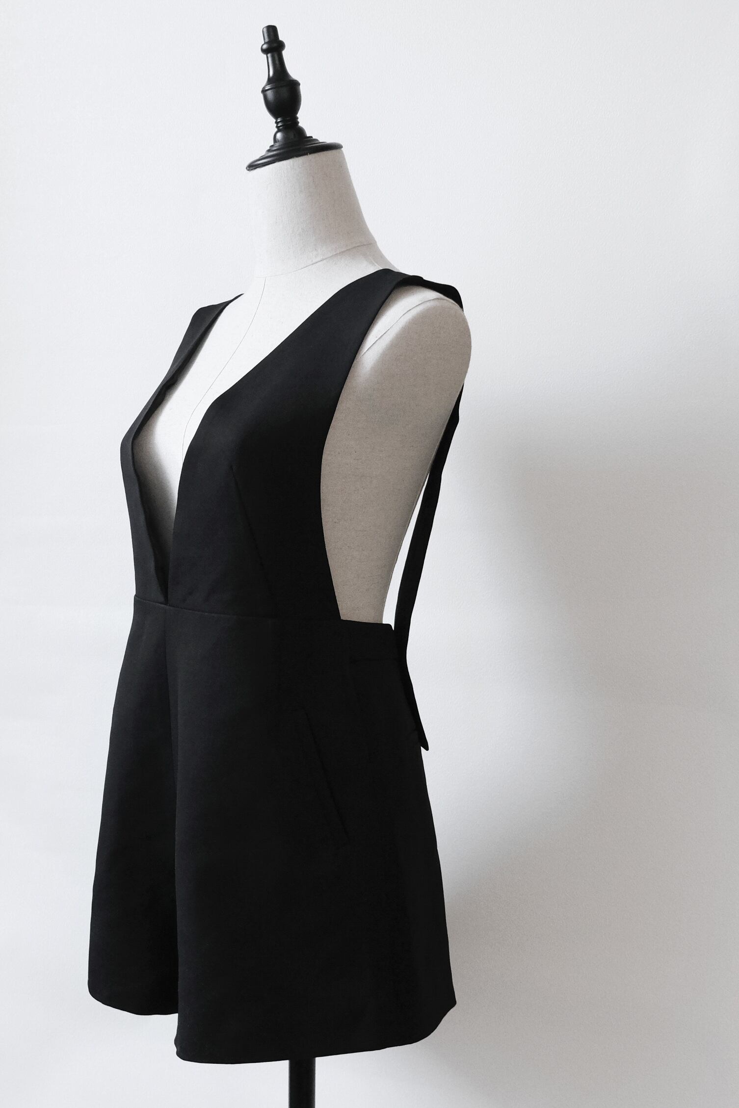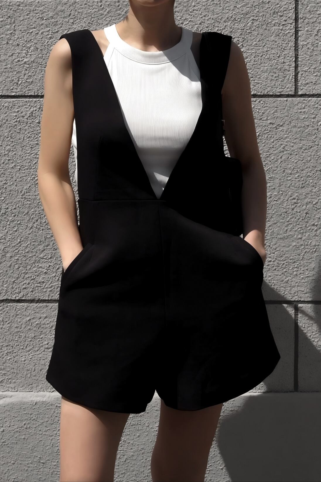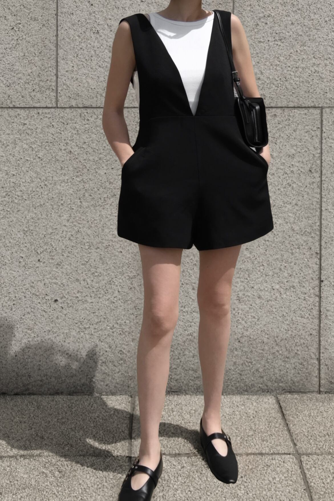 深めのVネックとショート丈の絶妙バランスが魅力のオールインワン。