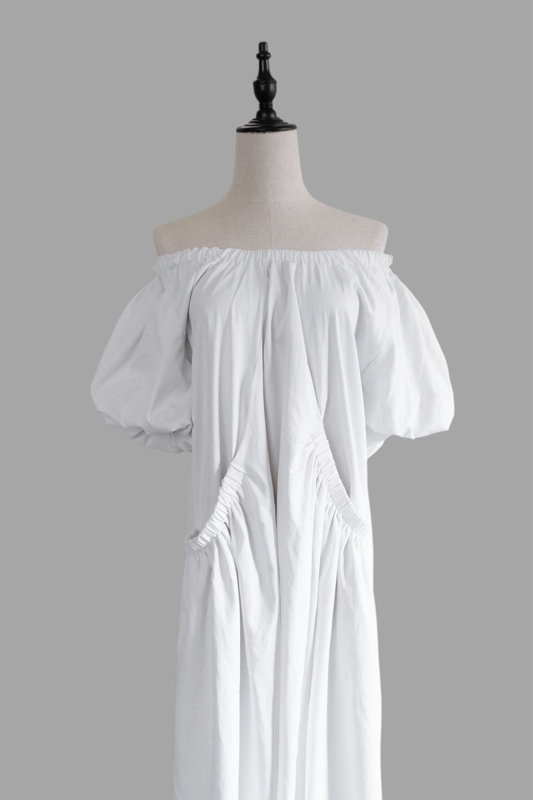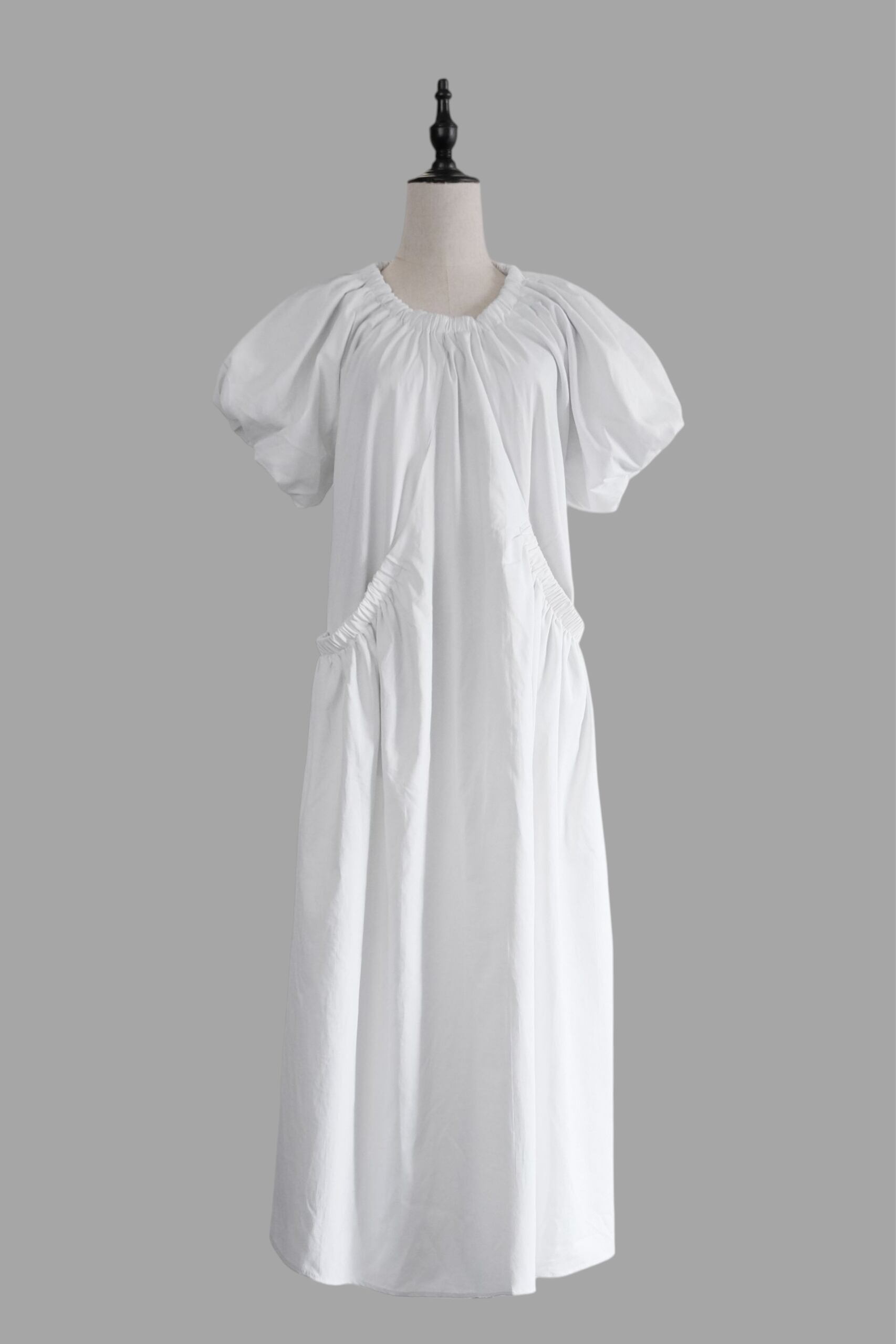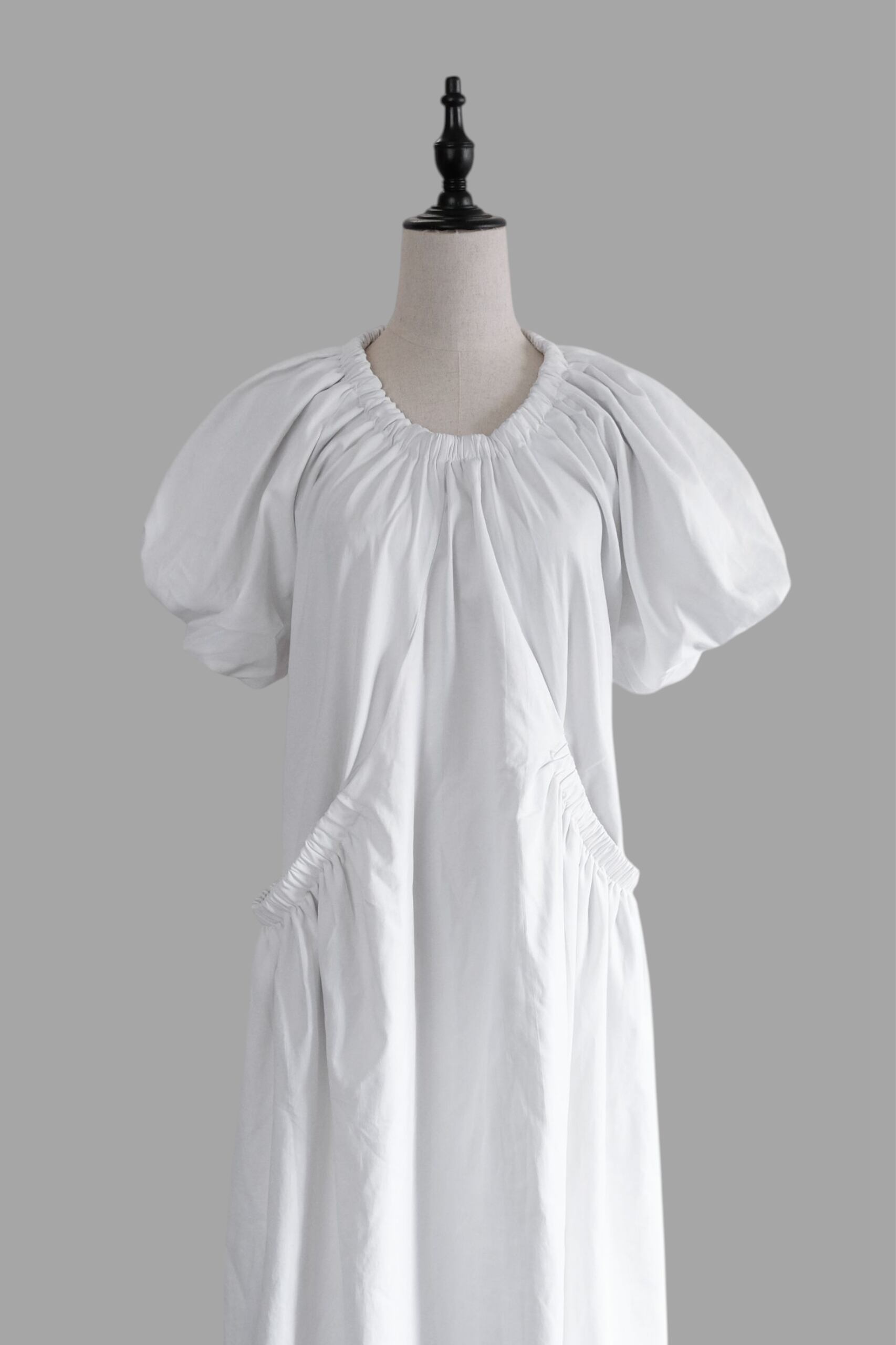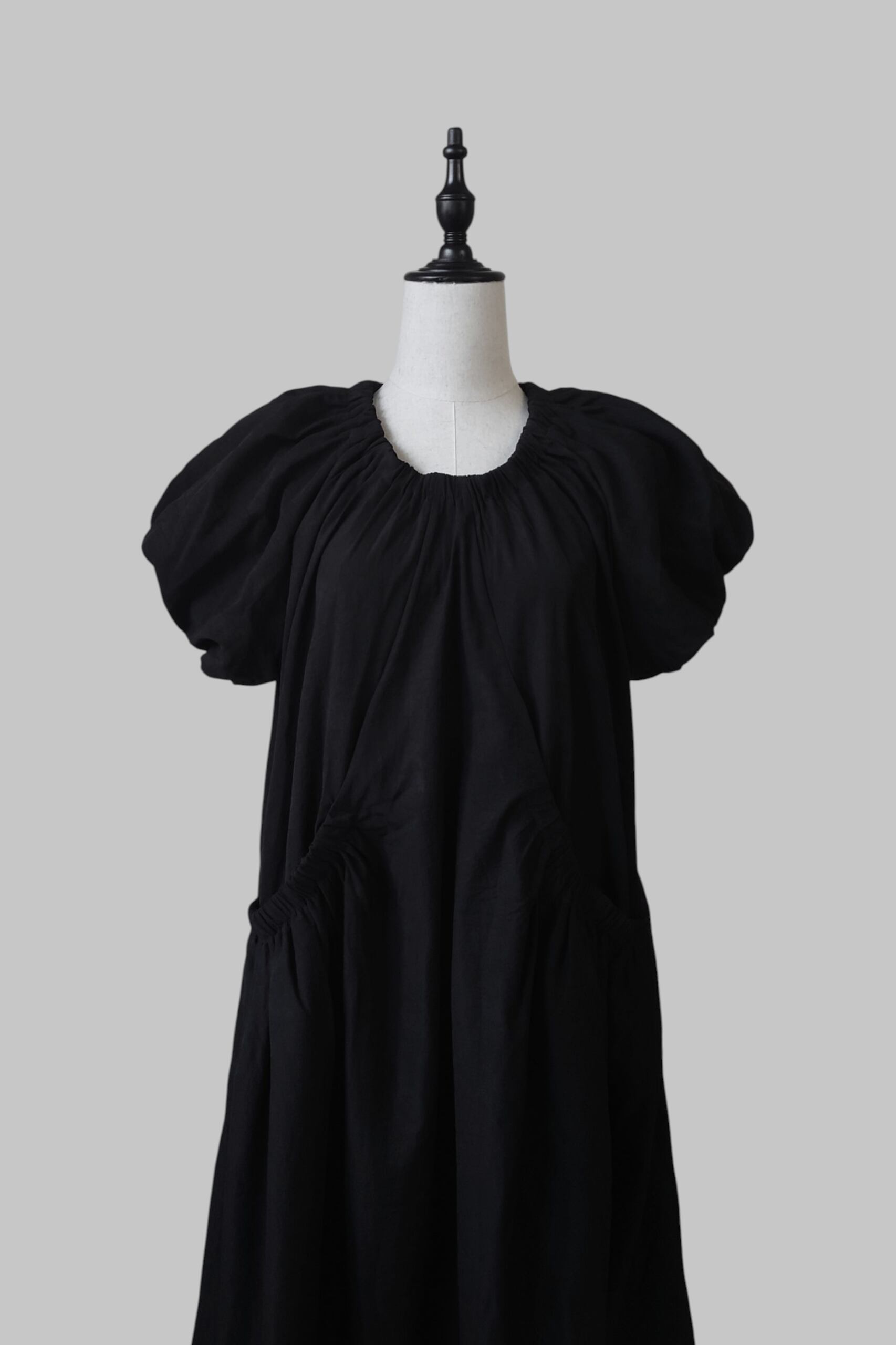 生地をふんだんに使用し、全体に施されたたっぷりのギャザーが動きに合わせて美しいドレープを生み出します。