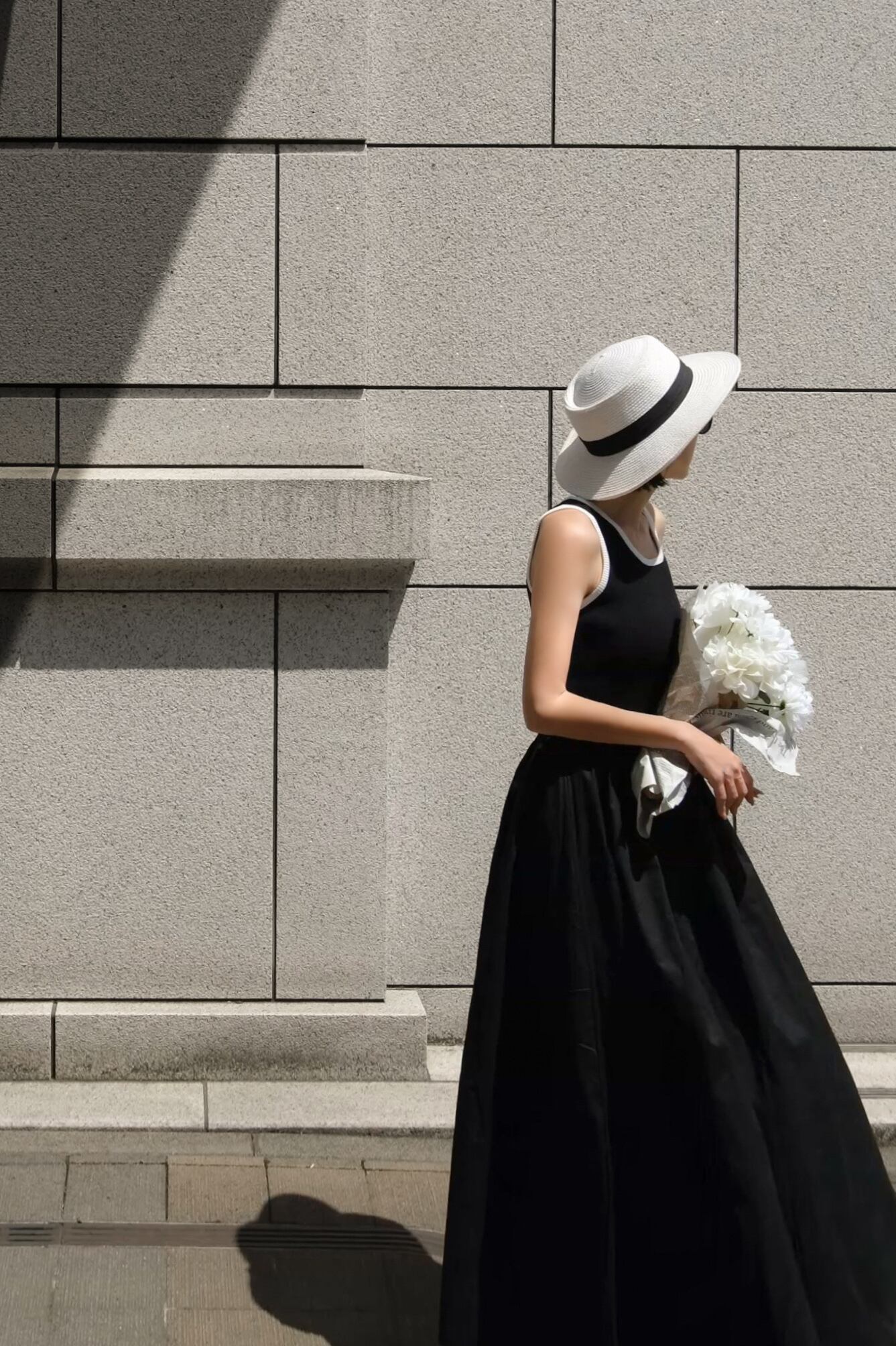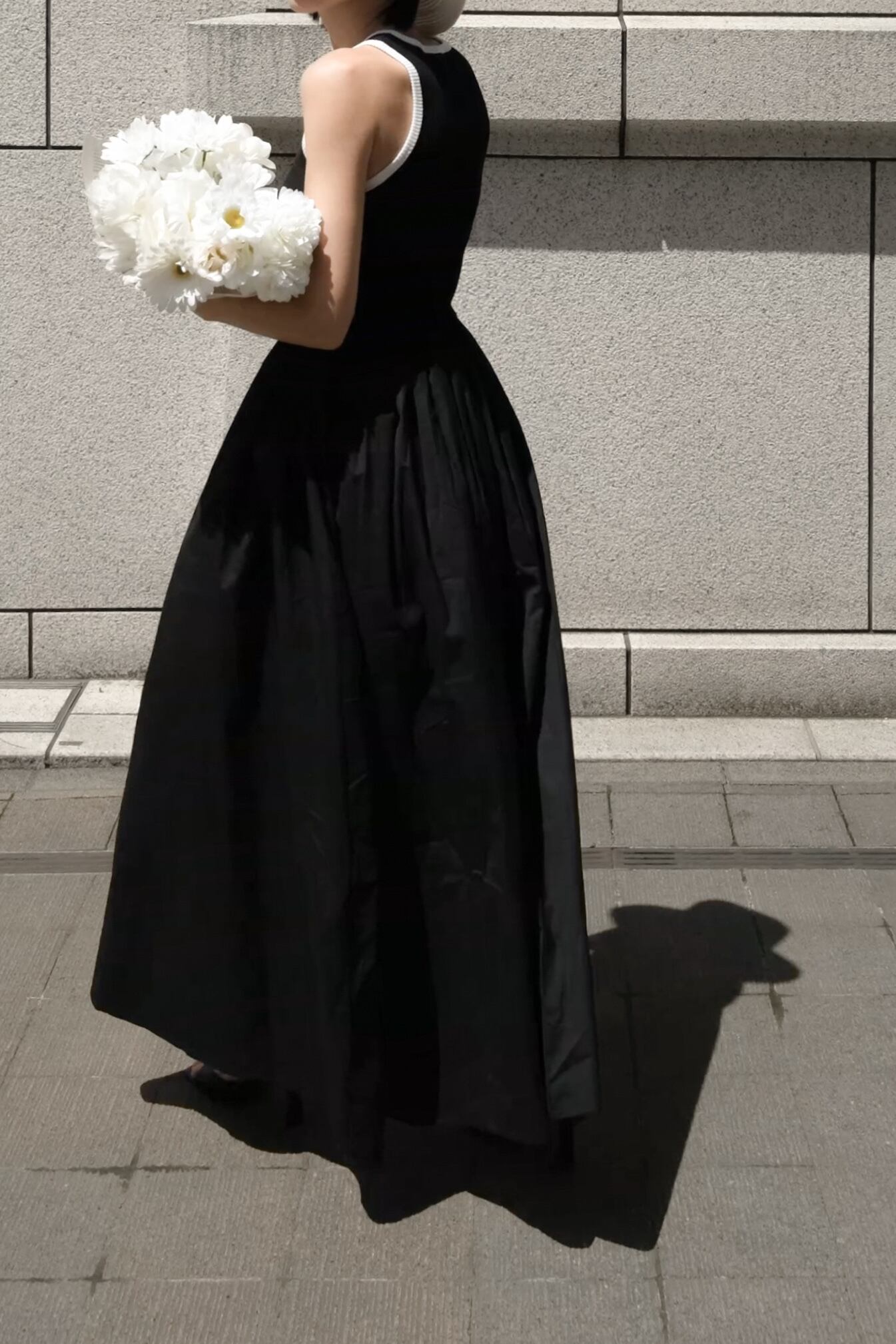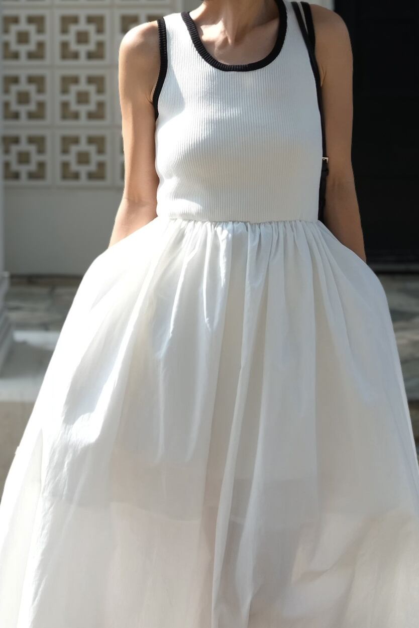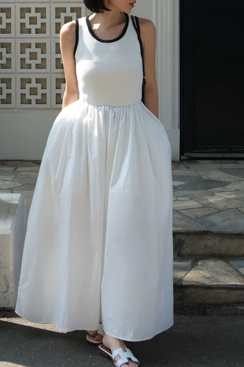 トップスは程よくフィットするリブ素材、スカート部分はハリのあるフレアシルエットで、異素材のコントラストがスタイルを引き立てます。