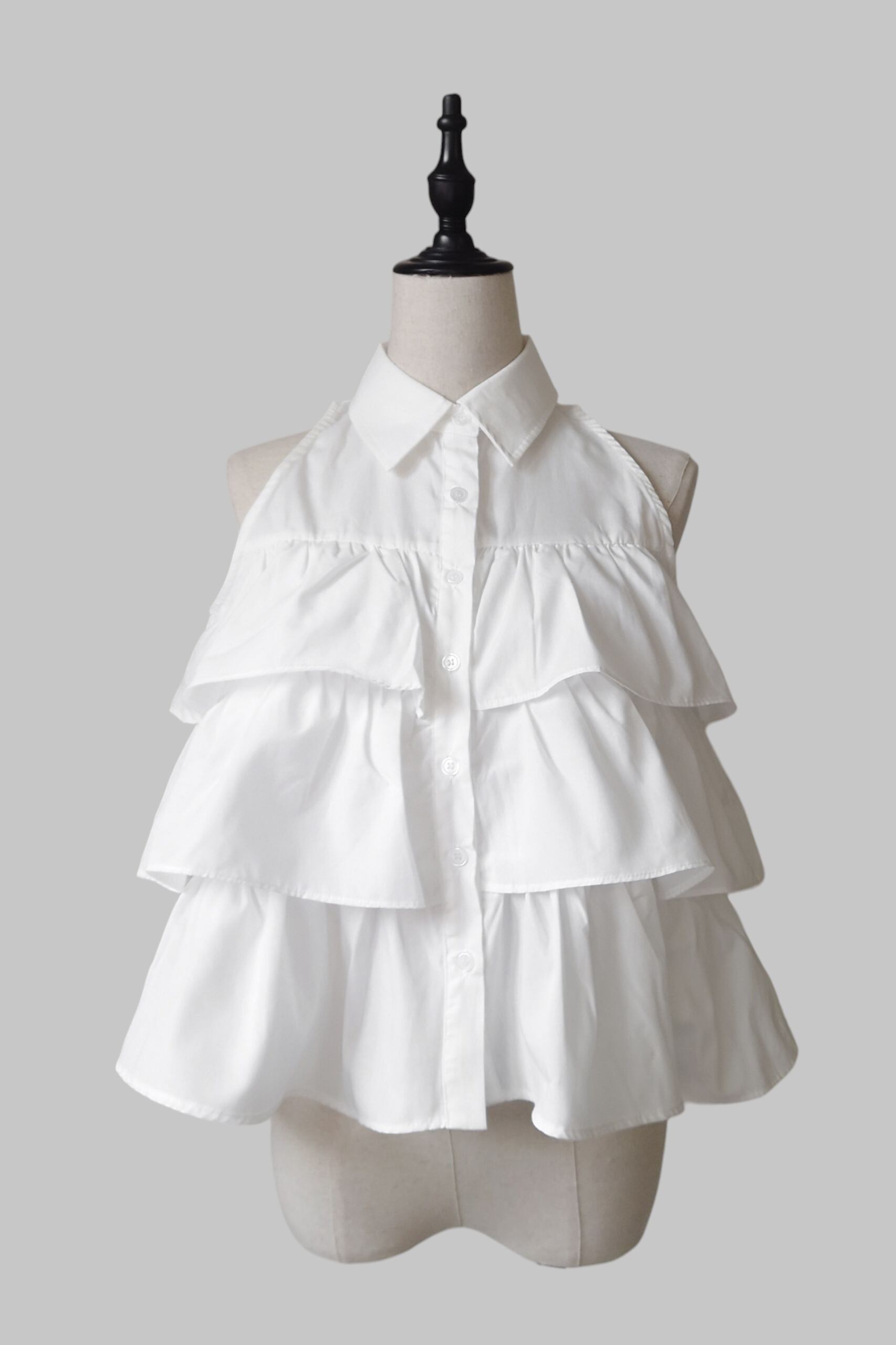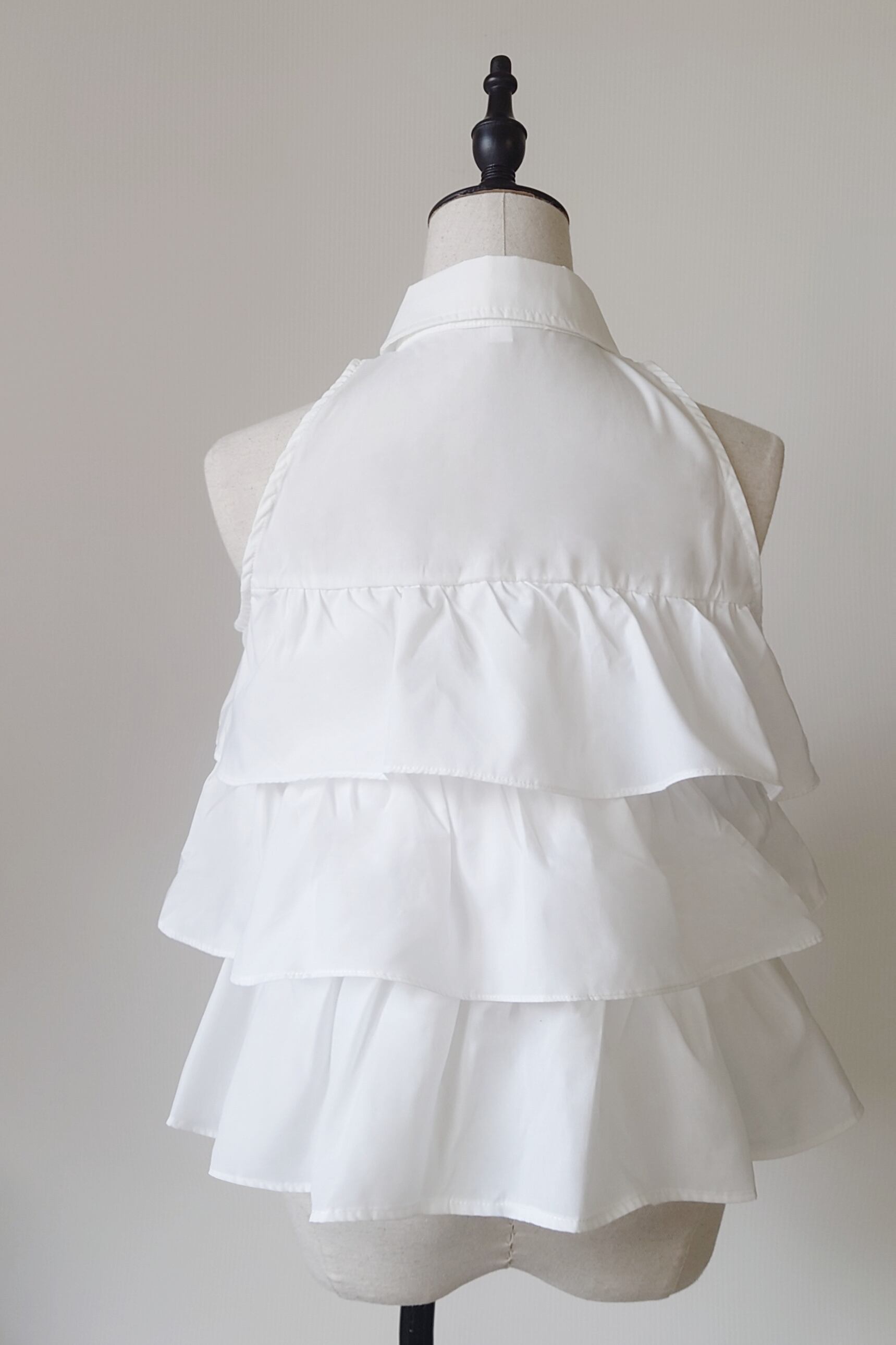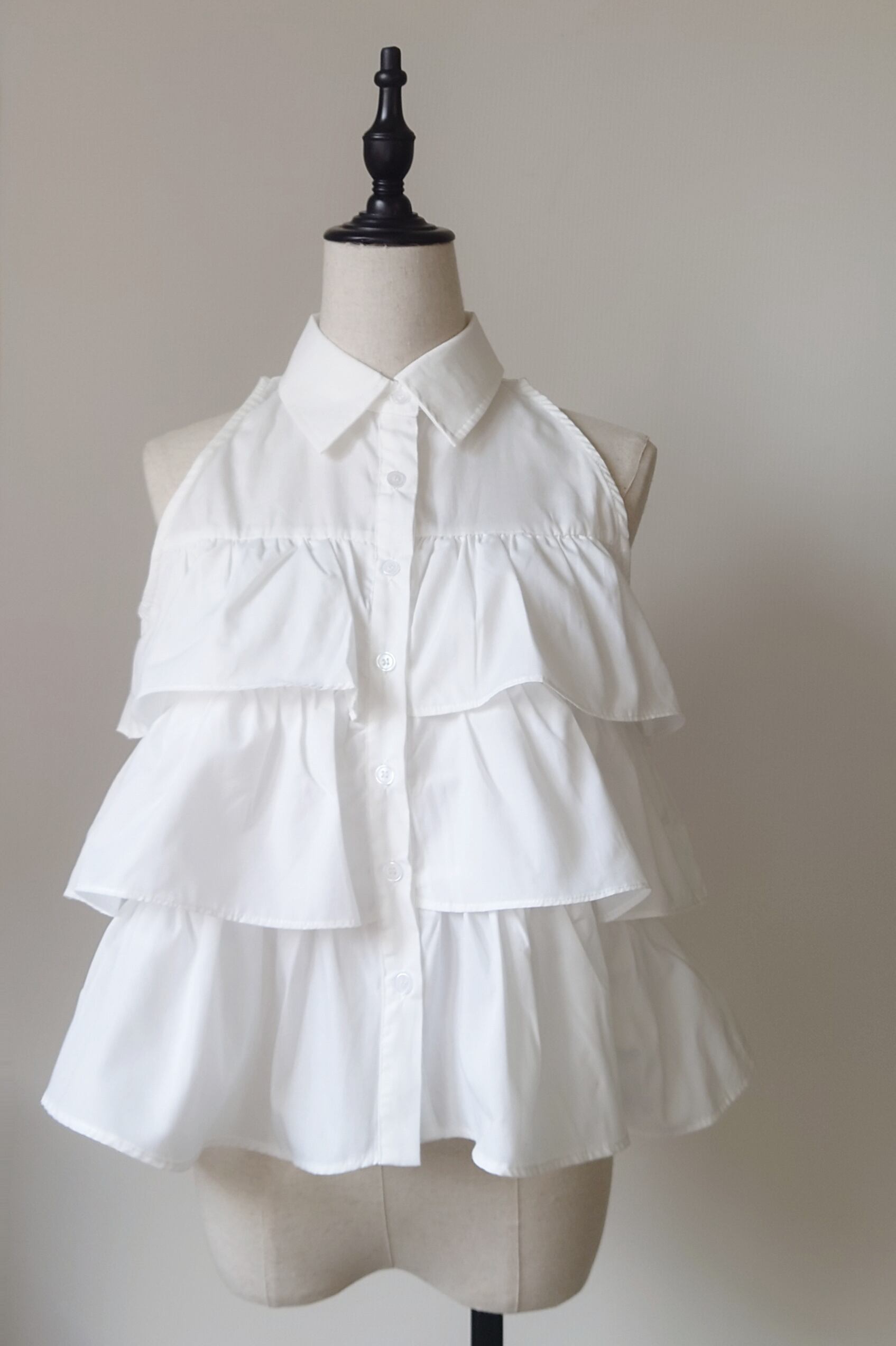 たっぷりと重ねられたフリルが目を惹く、ノースリーブシャツブラウス。
