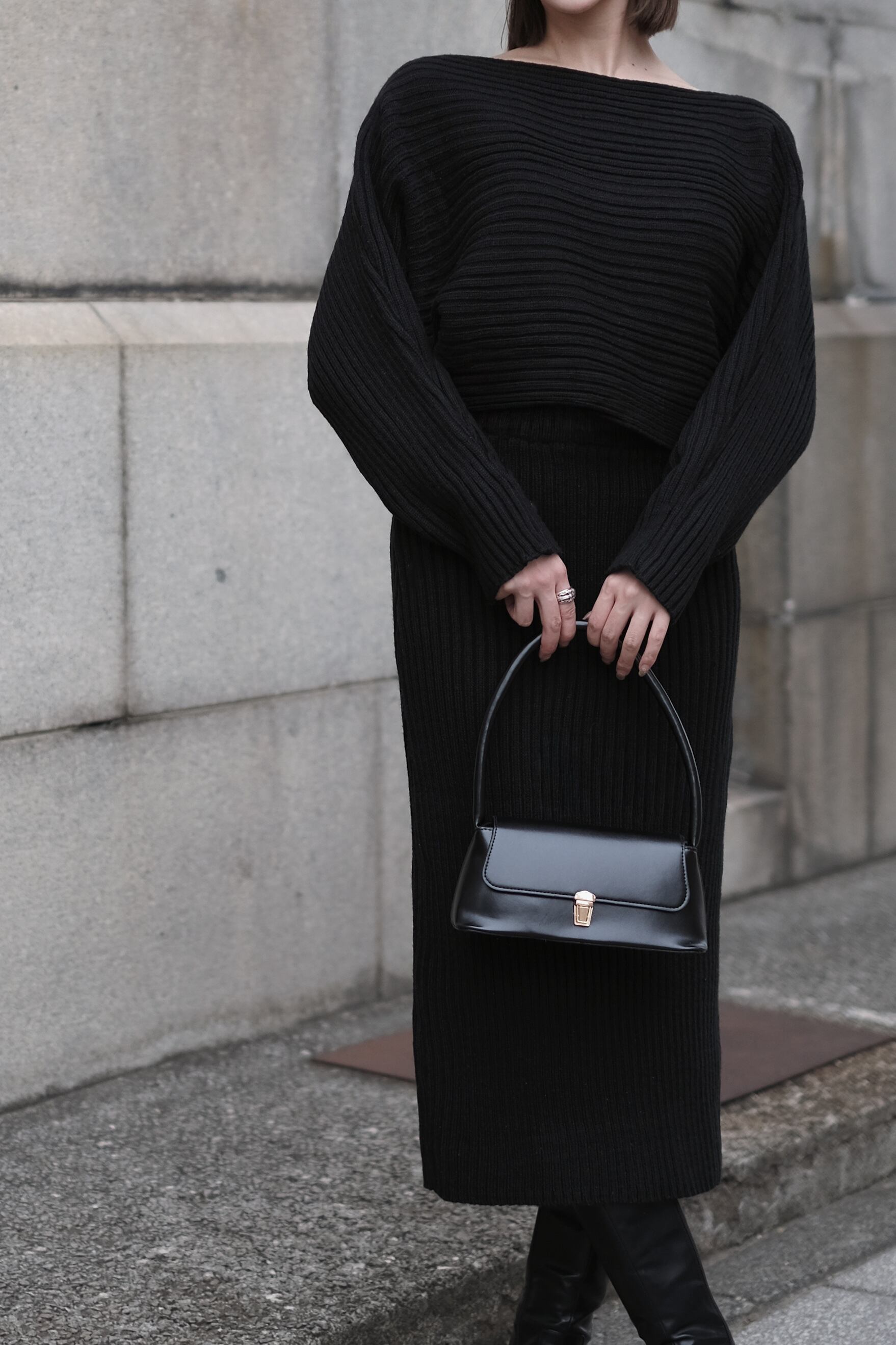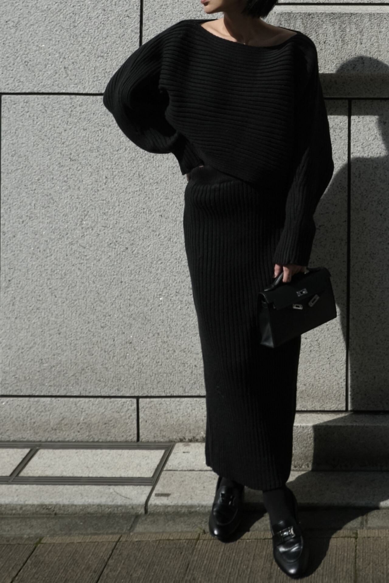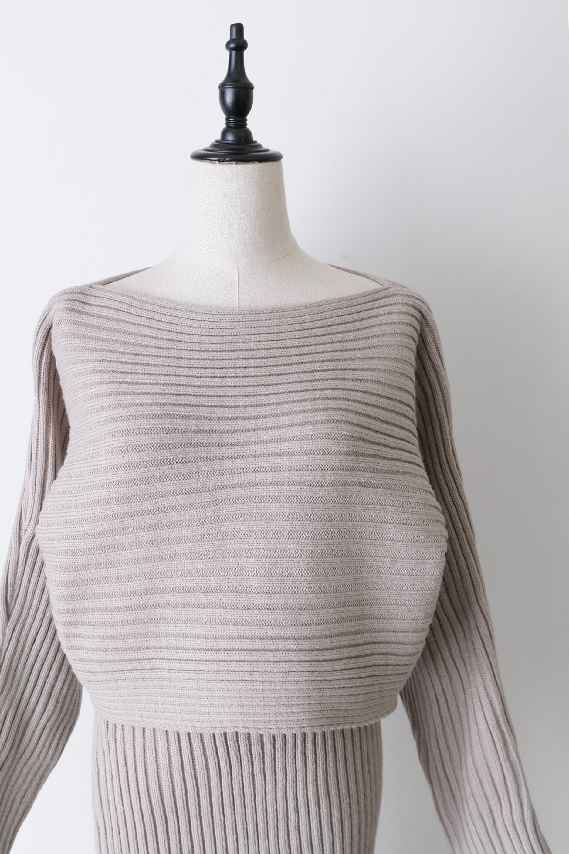 トップスとスカートのシンプルな組み合わせながら、存在感を放つのはしっかりと編み立てられた太めのリブと、あえて仕上げた程よいハリ感。