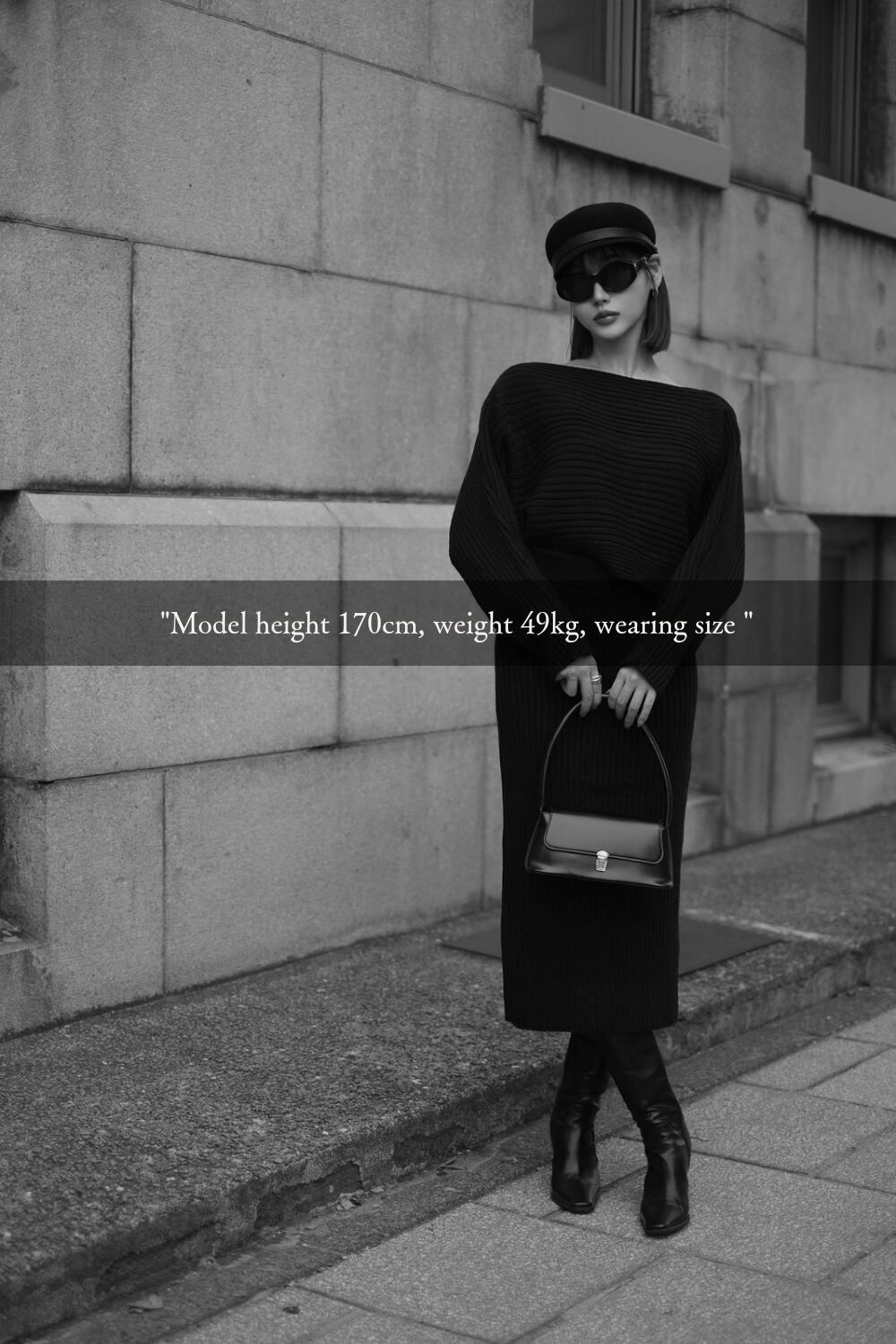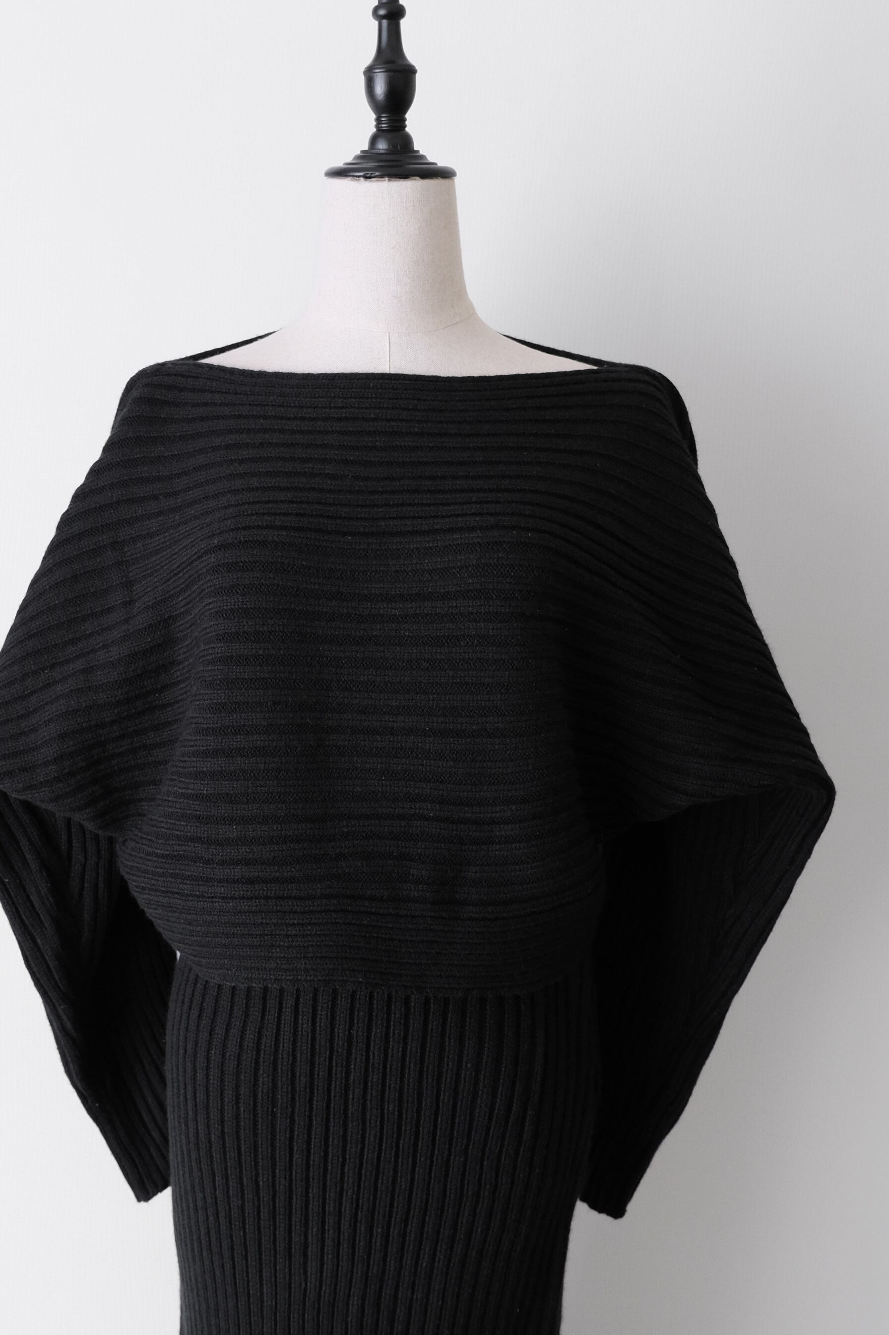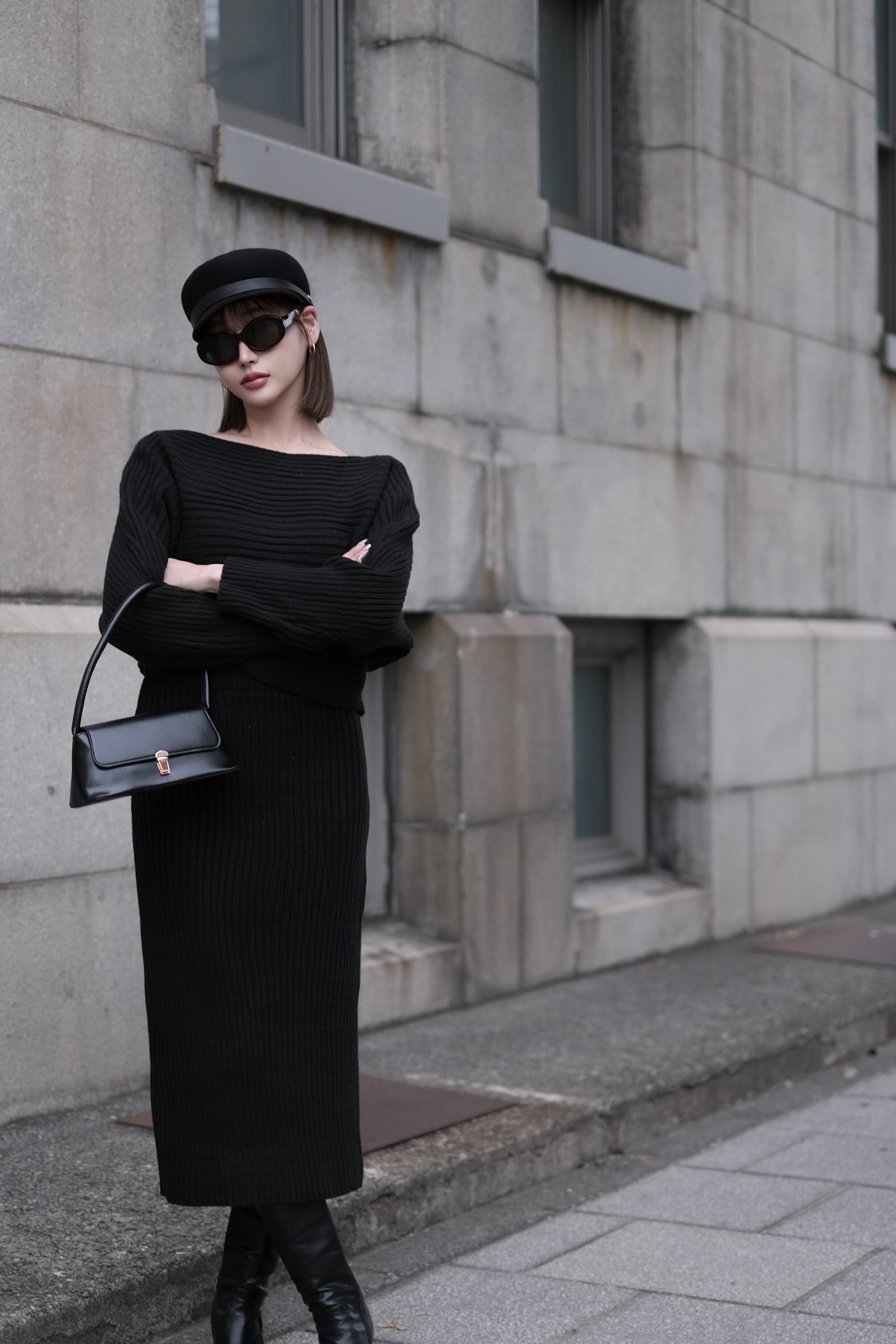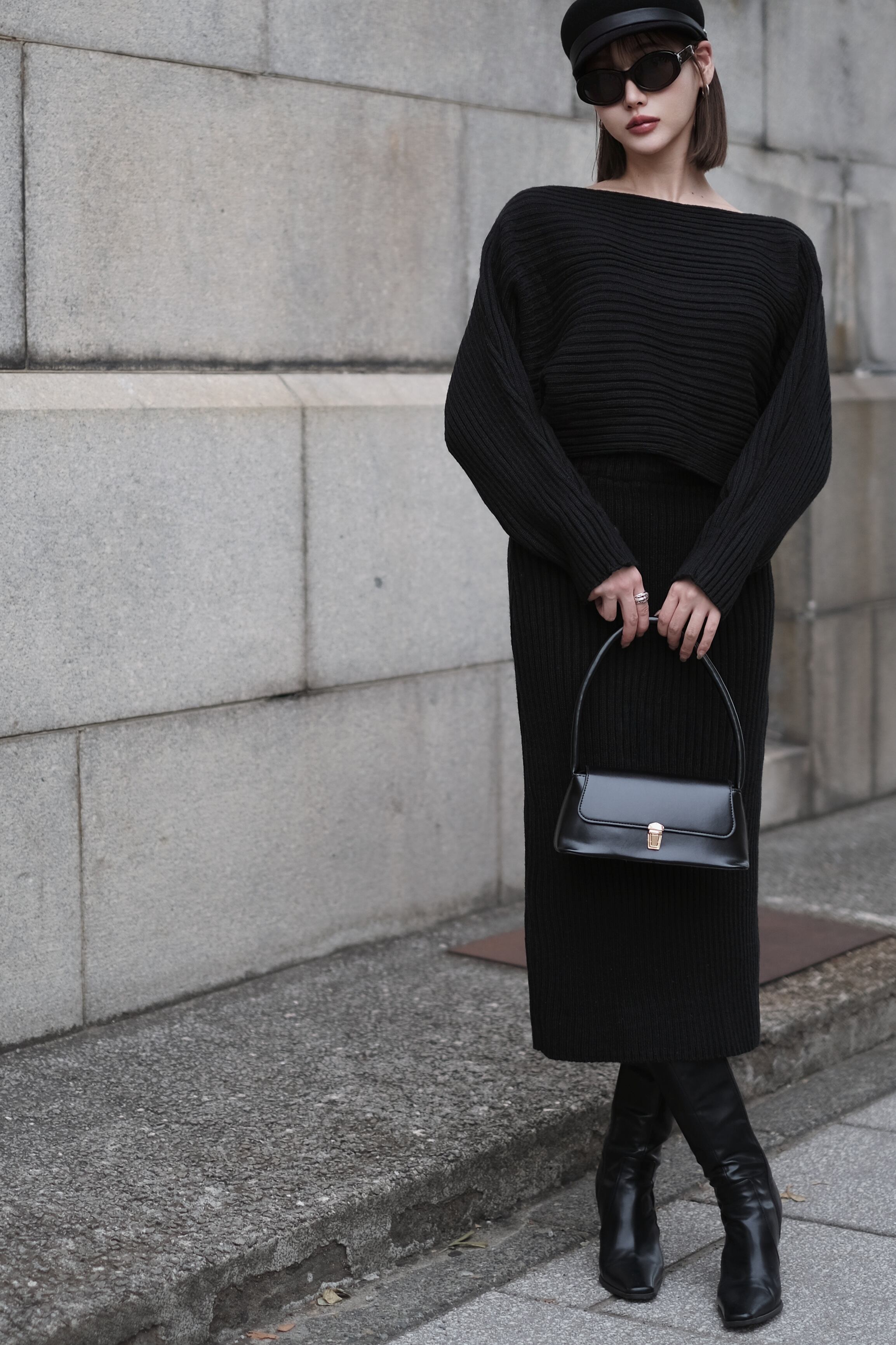トップスとスカートのシンプルな組み合わせながら、存在感を放つのはしっかりと編み立てられた太めのリブと、あえて仕上げた程よいハリ感。