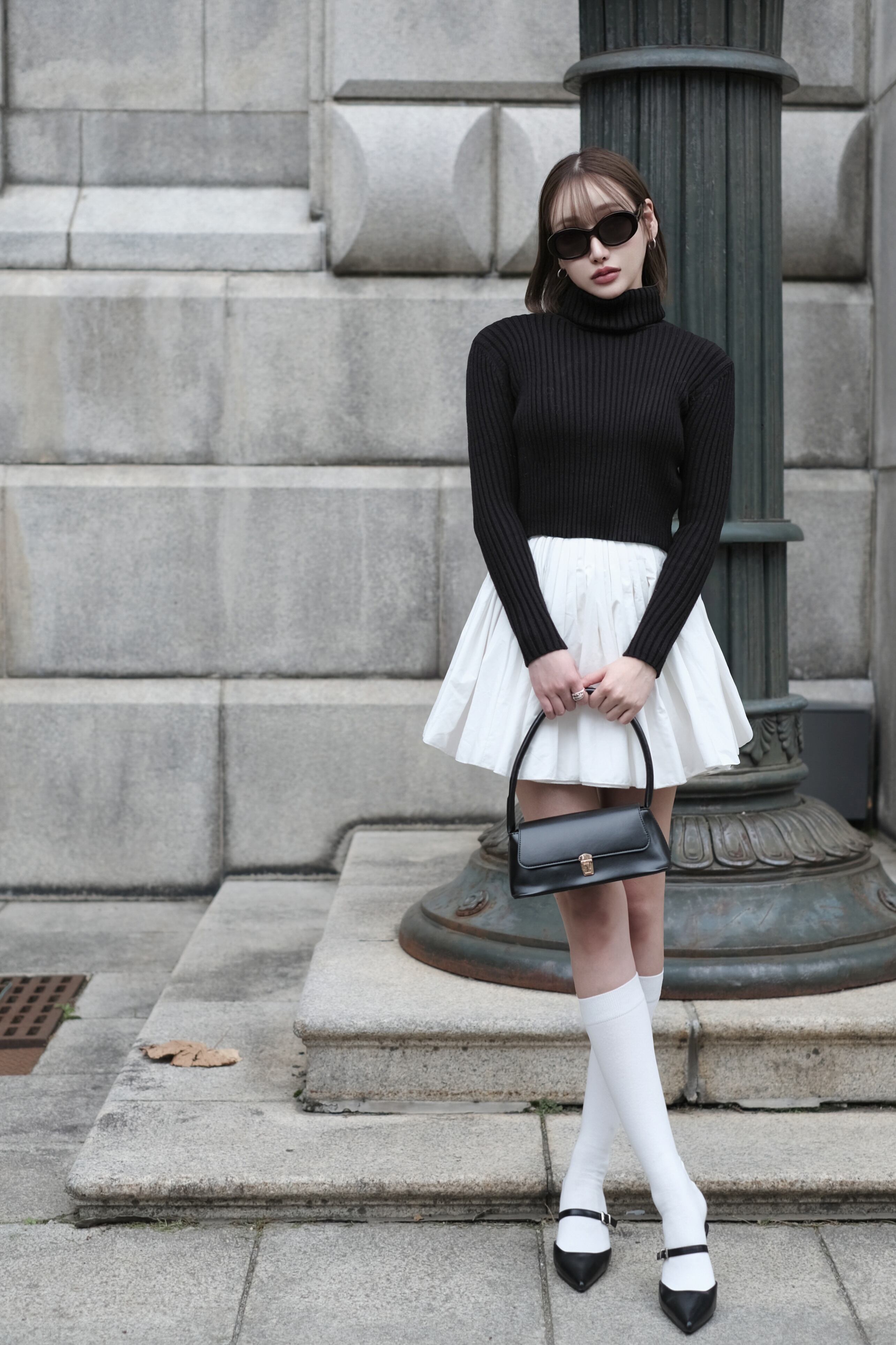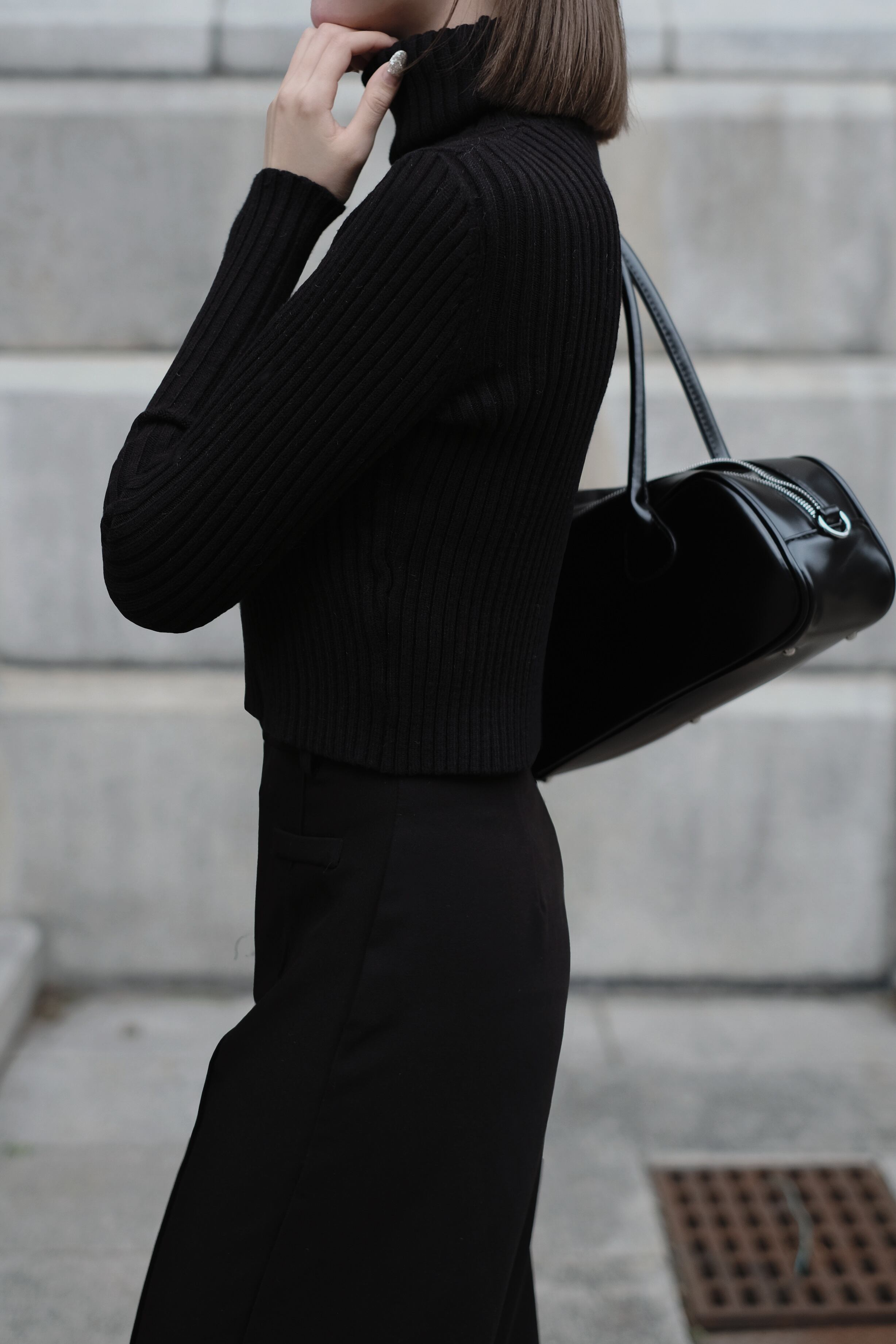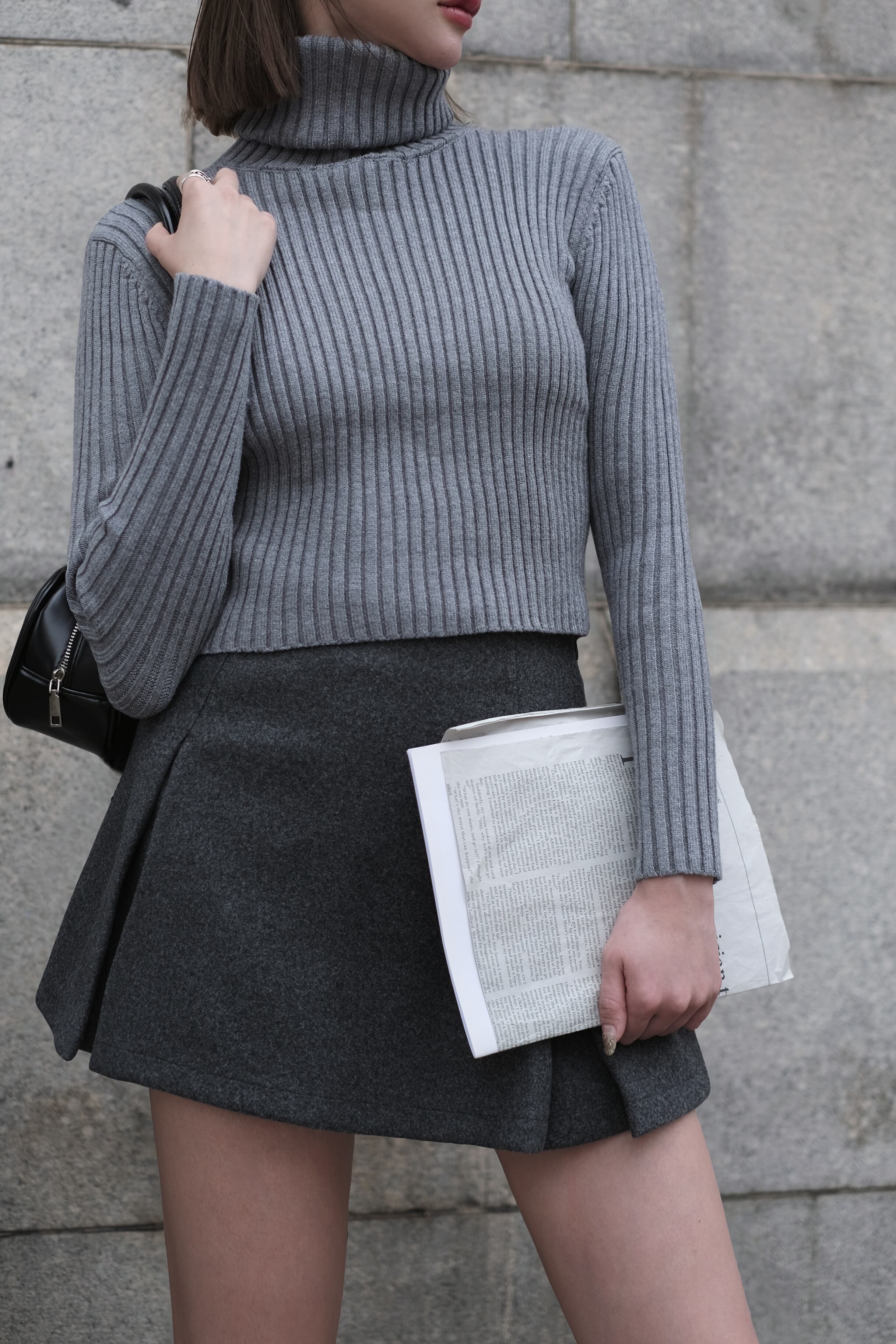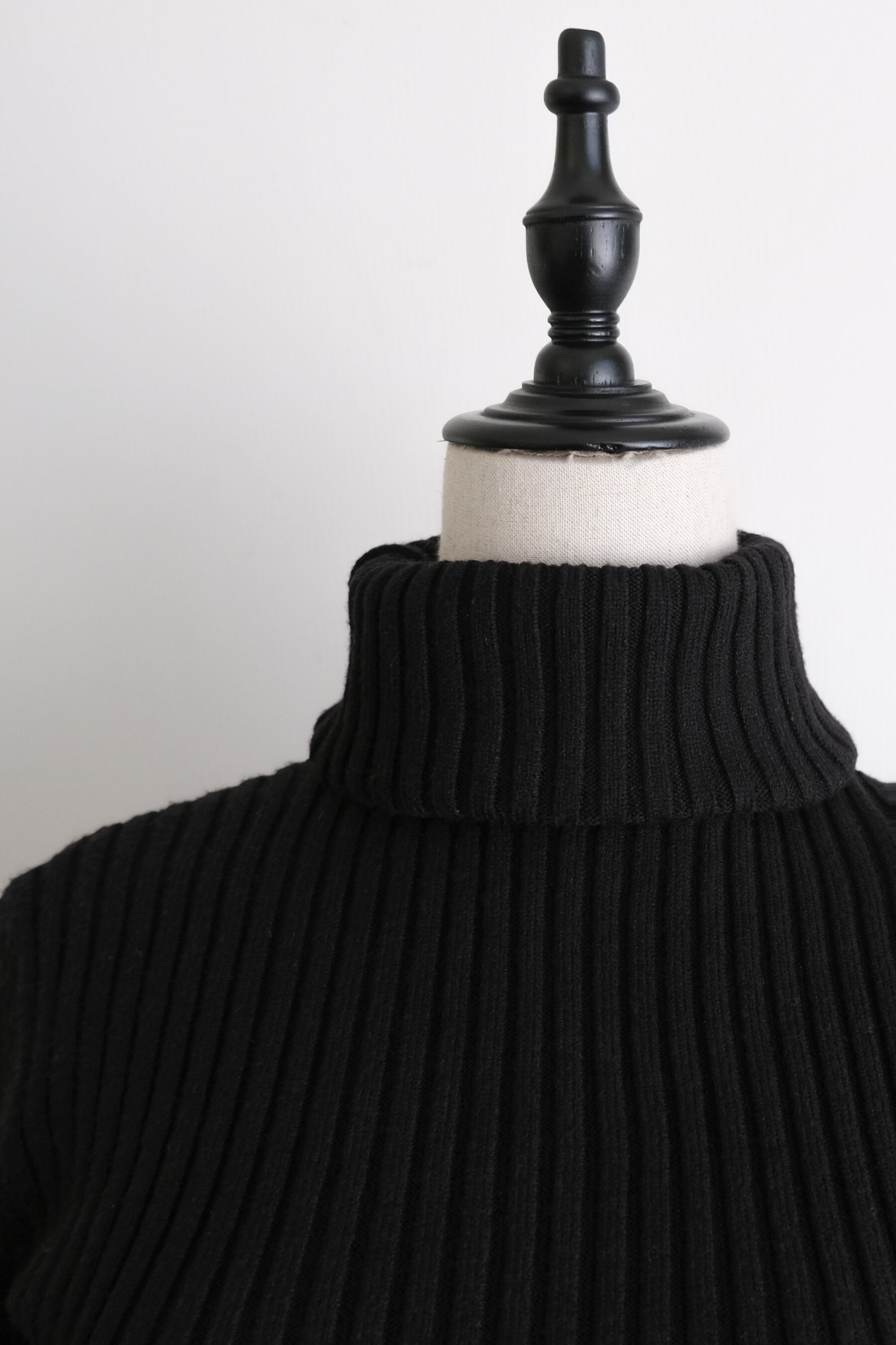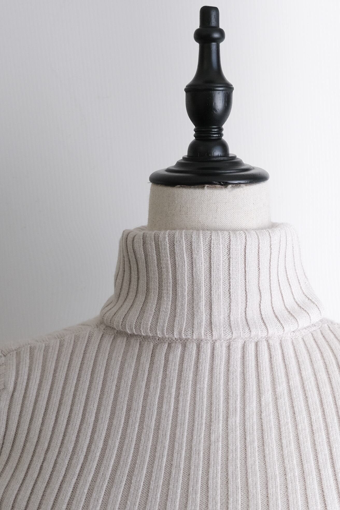 太めのリブ編みで立体感を出した、シンプルながらも存在感のあるハイネックニット。