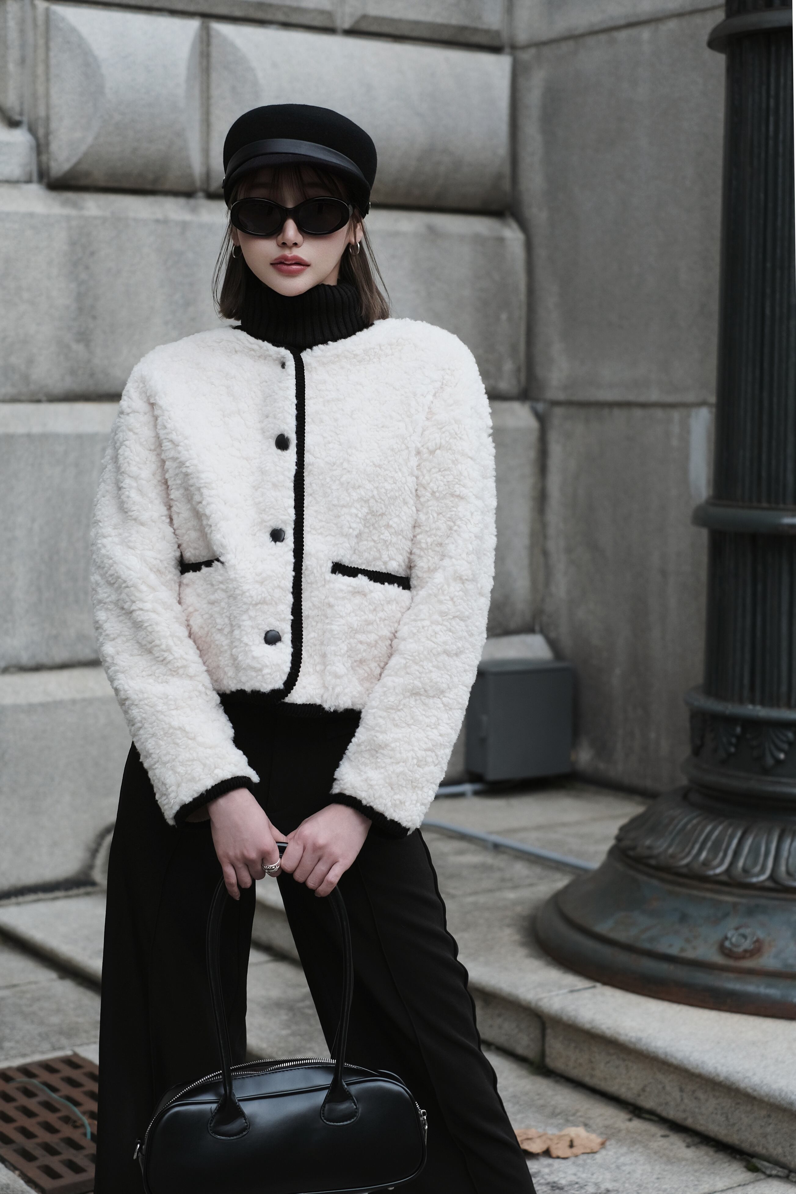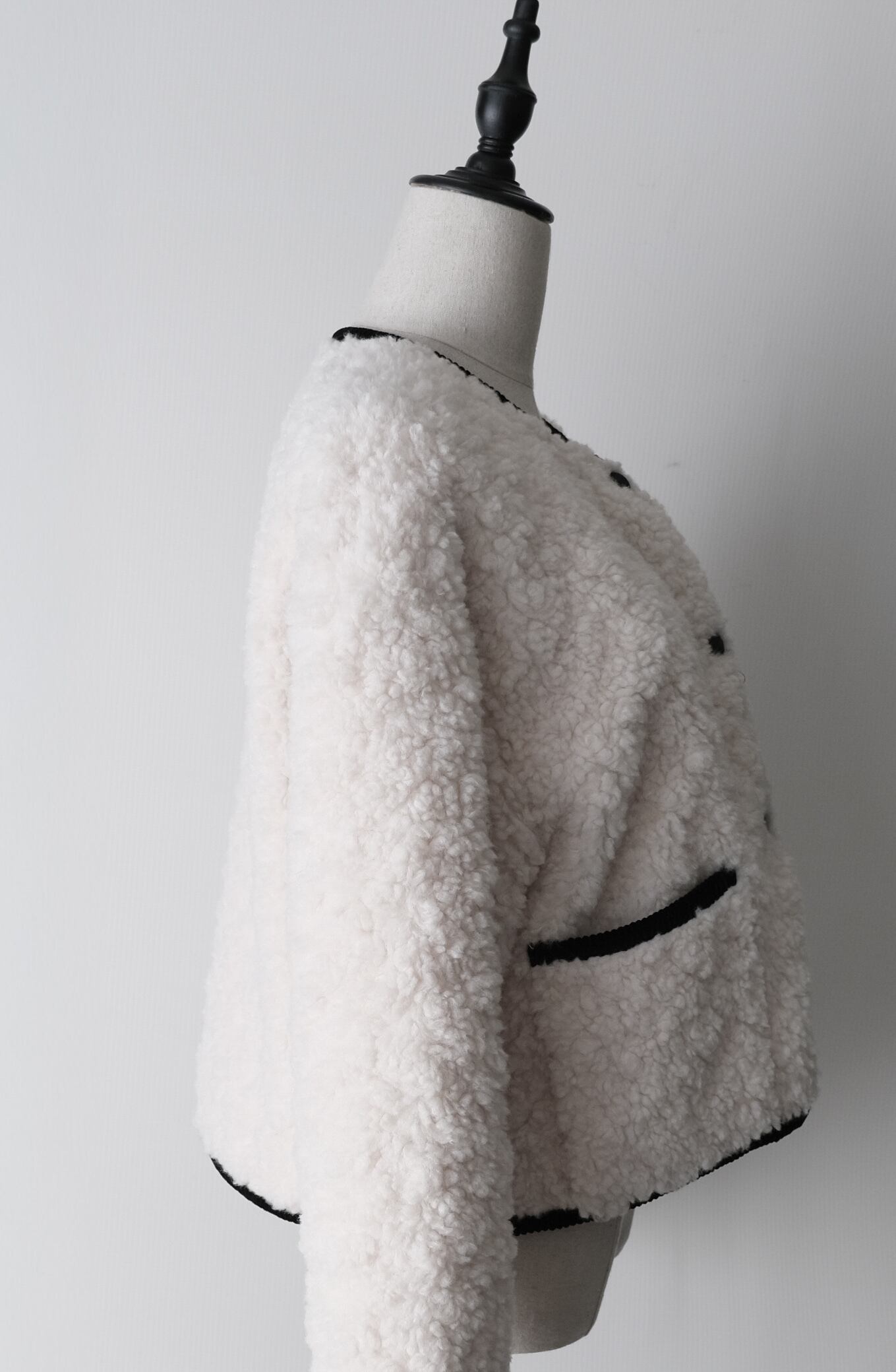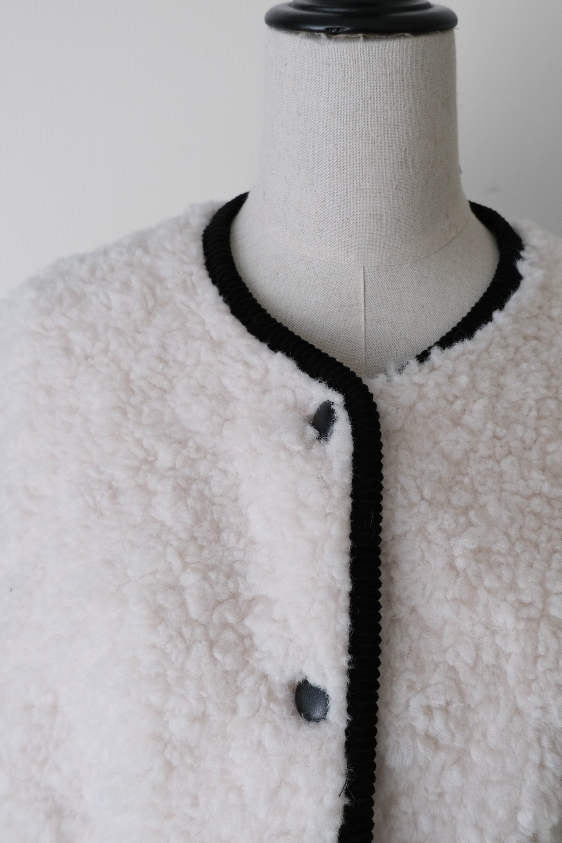 表面はふんわりとしたボア、内側はスエード調の柔らかな仕上がりで、肌あたりの良さも魅力のノーカラージャケット。