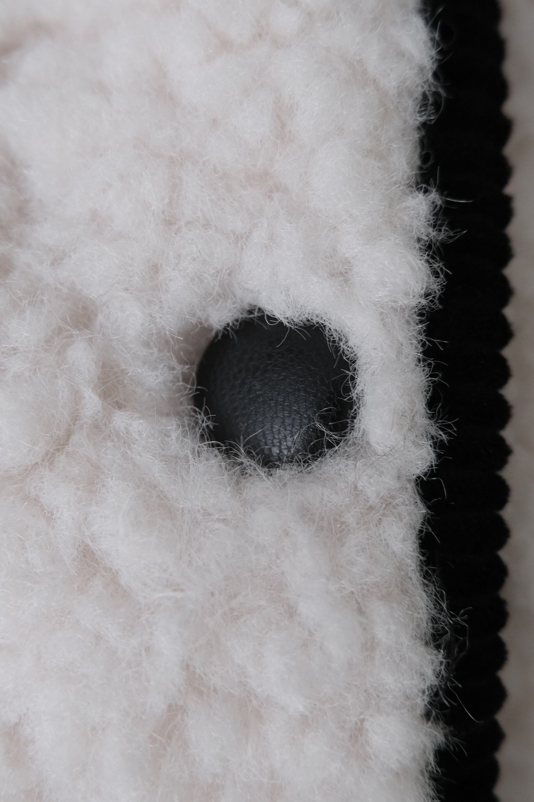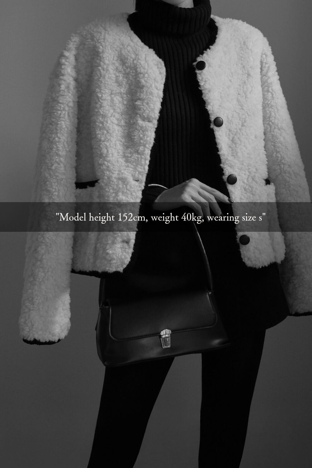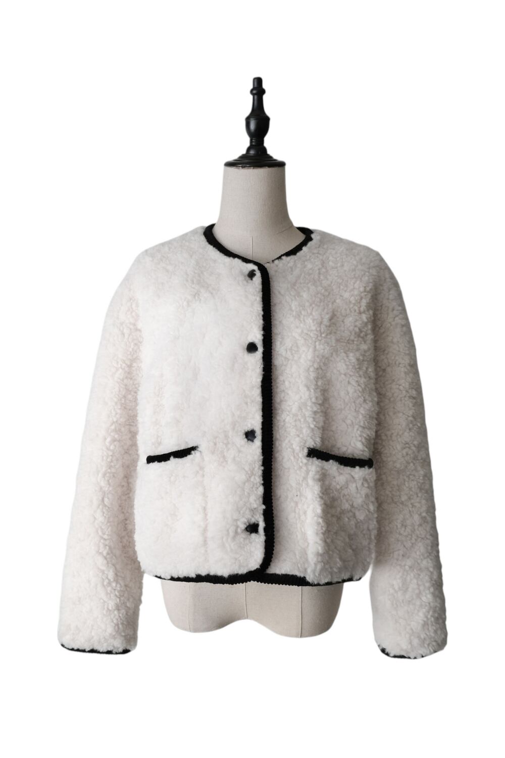 表面はふんわりとしたボア、内側はスエード調の柔らかな仕上がりで、肌あたりの良さも魅力のノーカラージャケット。