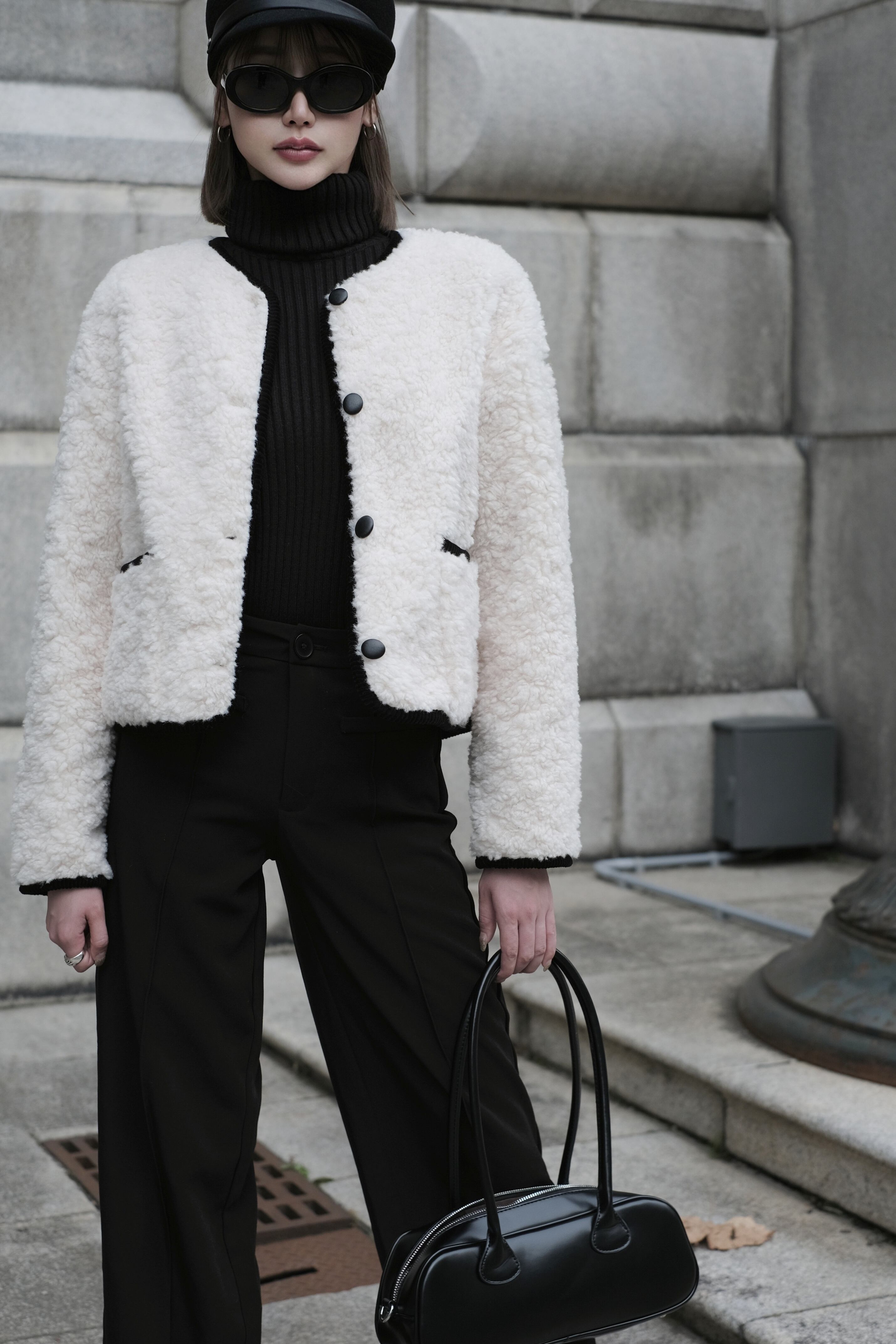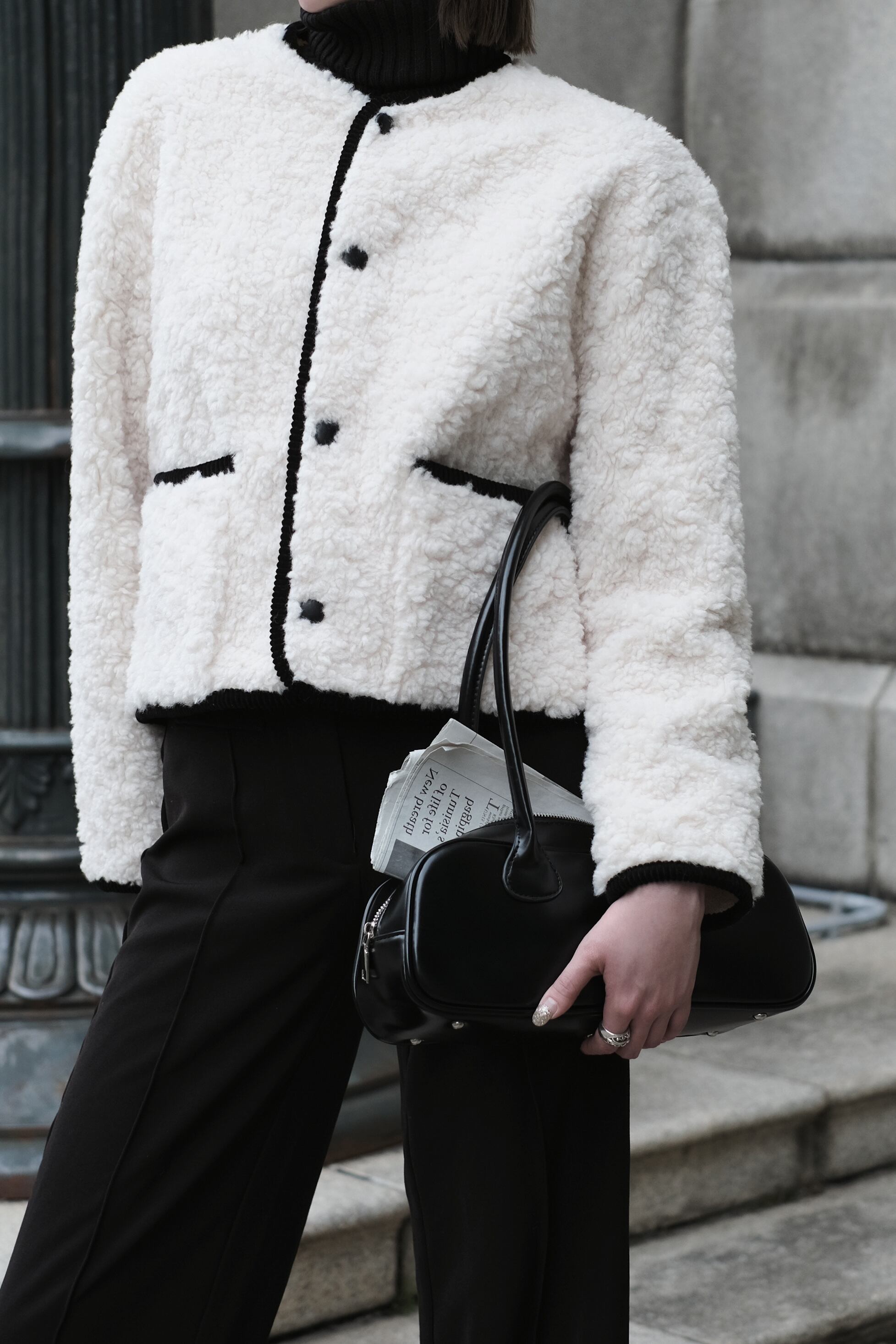 コントラストを効かせた黒のパイピングが全体を引き締め、クラシカルでありながらモードな印象に。