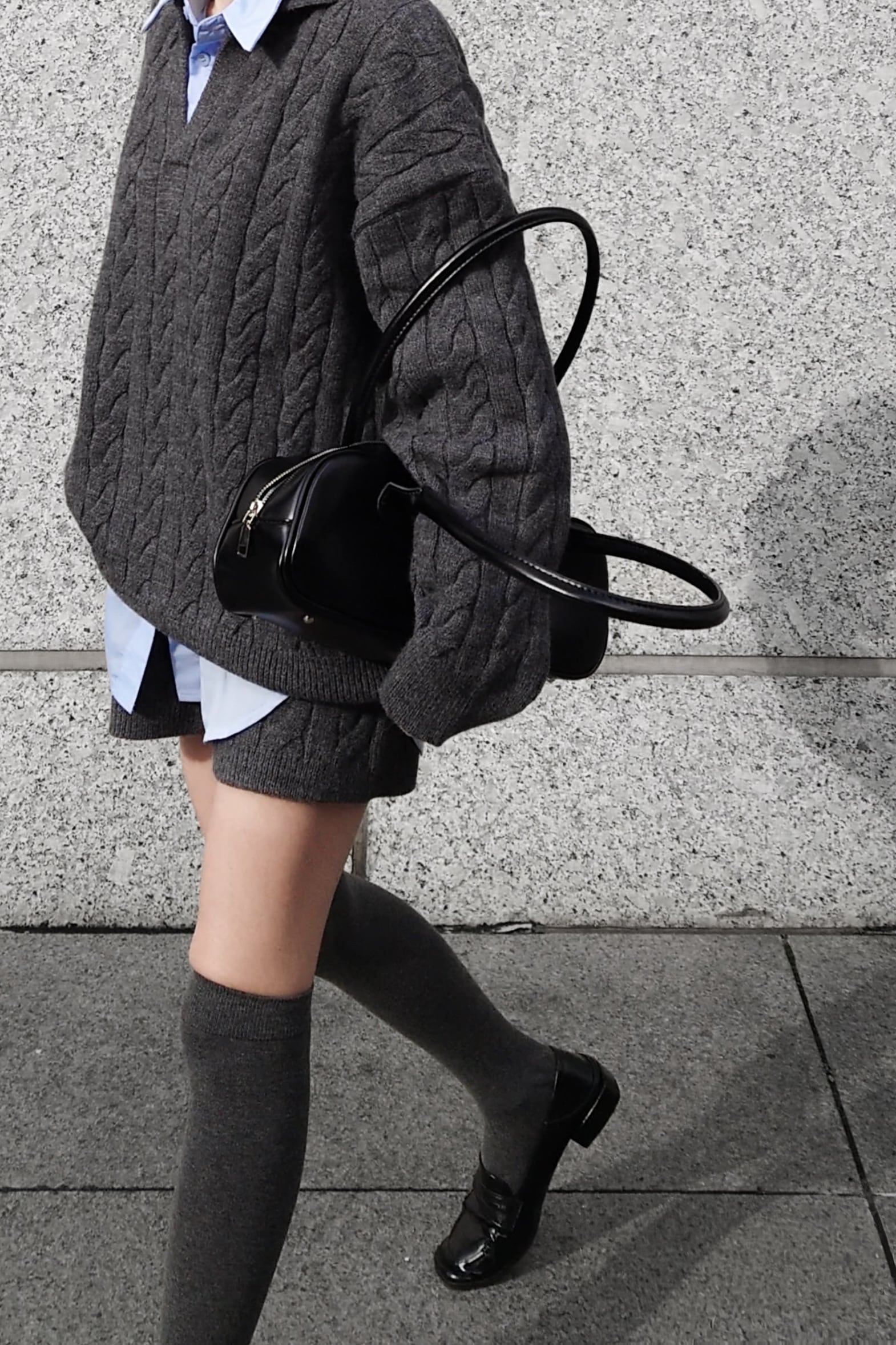 ブラックニットにはホワイトシャツ、グレーニットにはブルーシャツの組み合わせです。