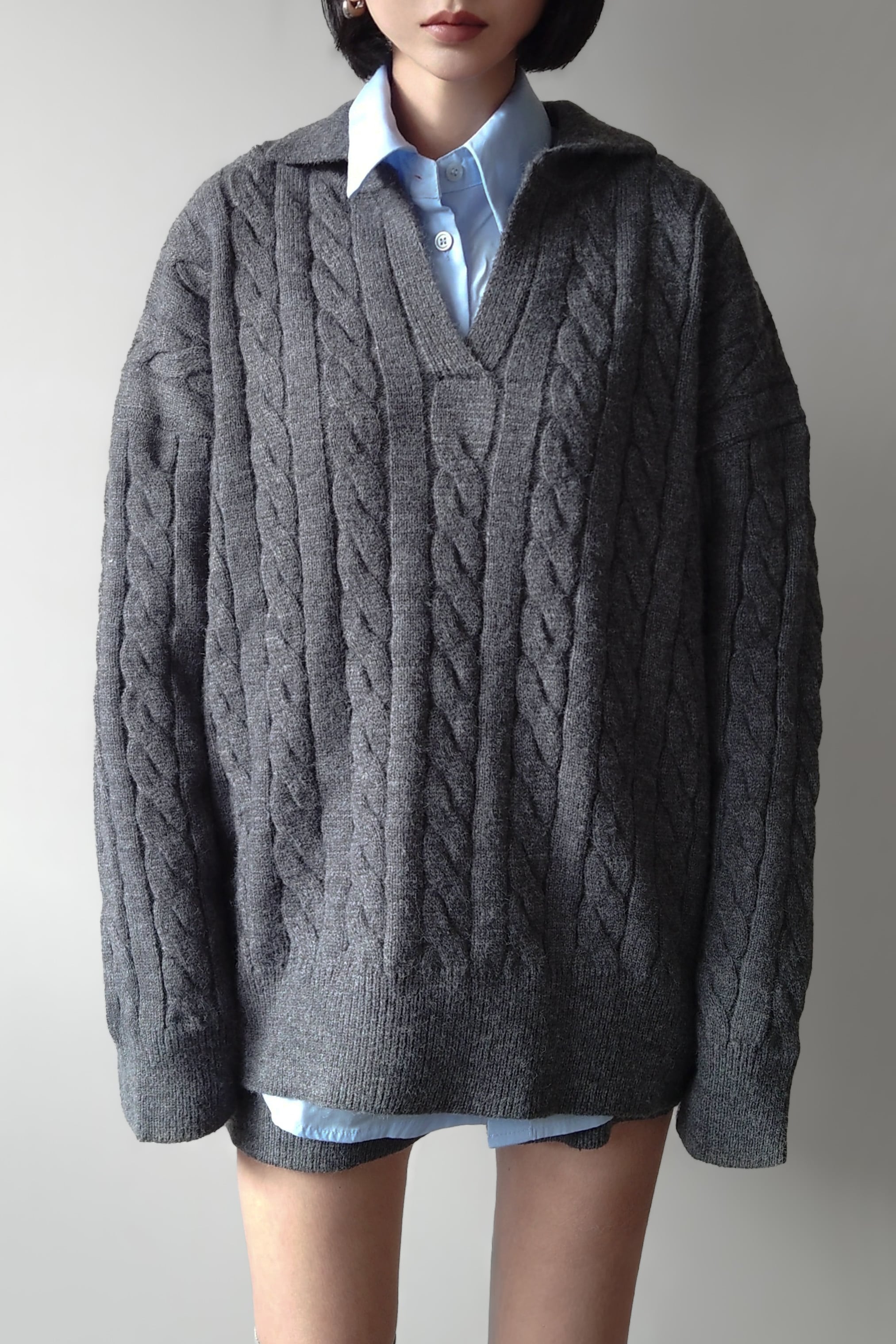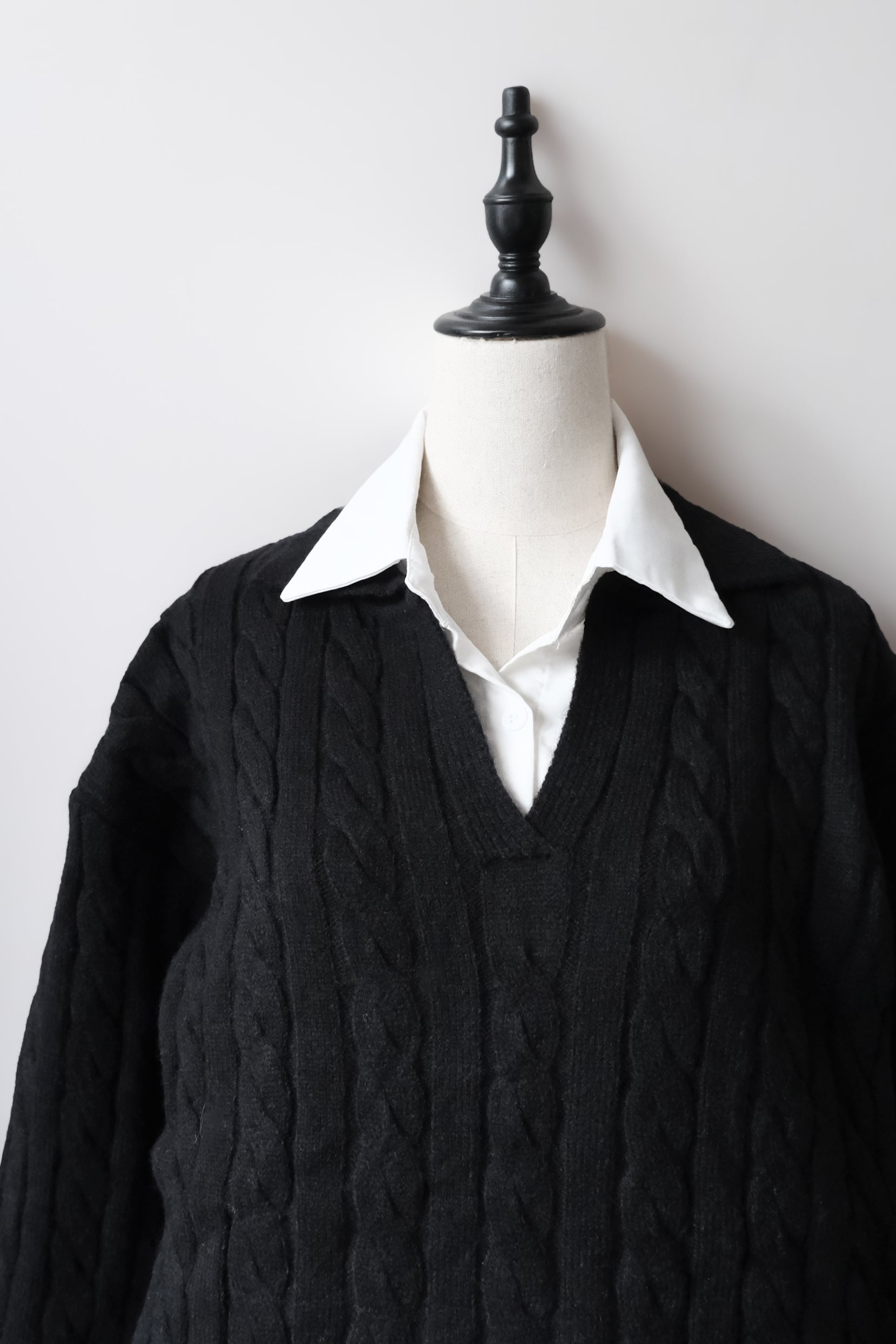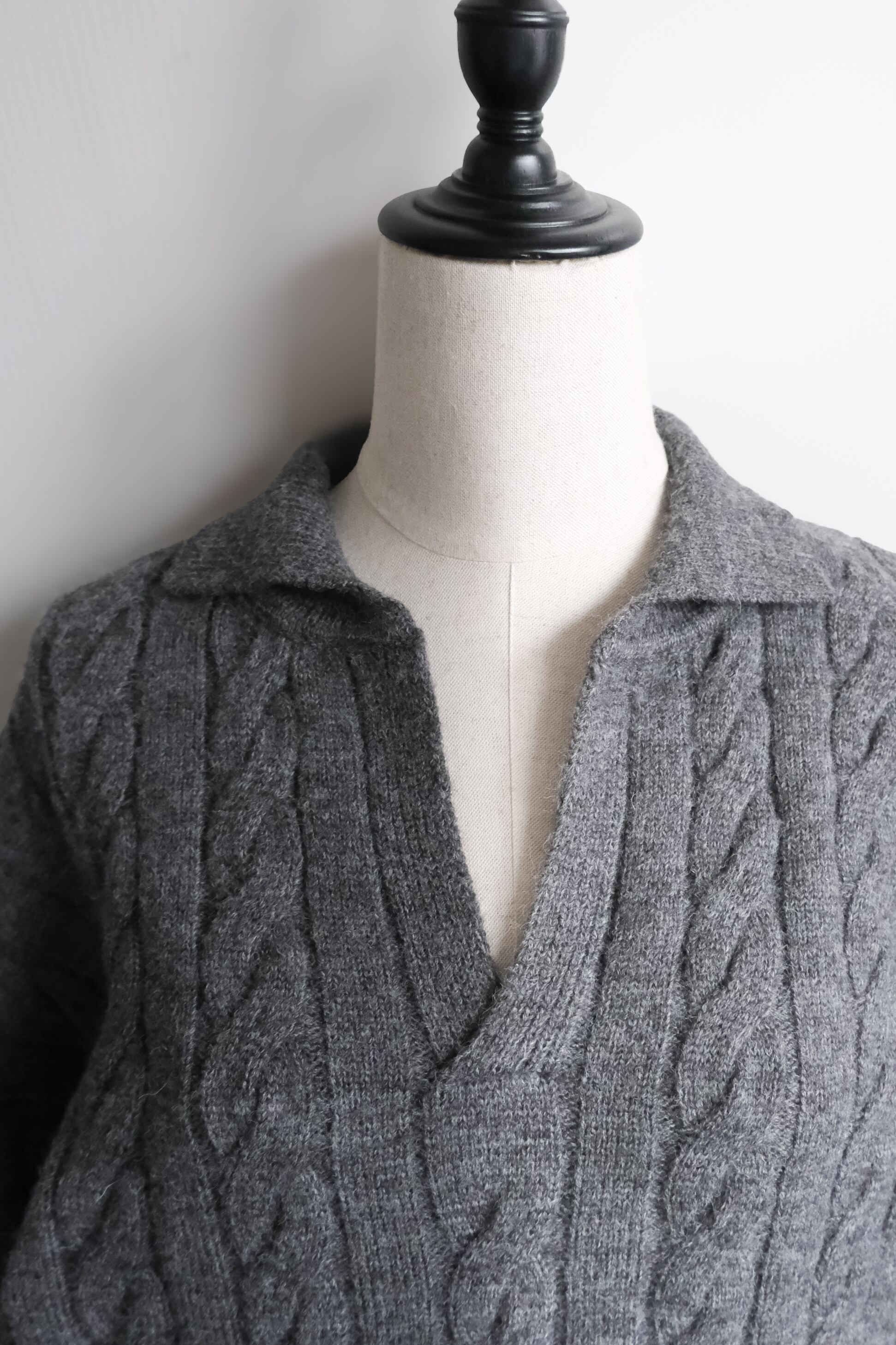 襟付きのケーブルニットは、ふんわりと柔らかい風合いで、