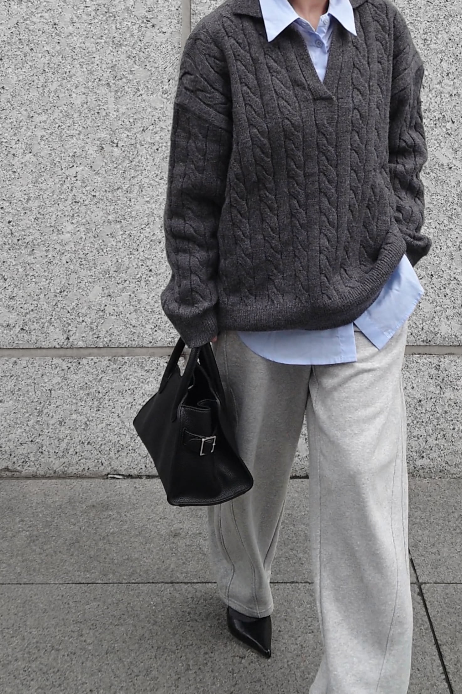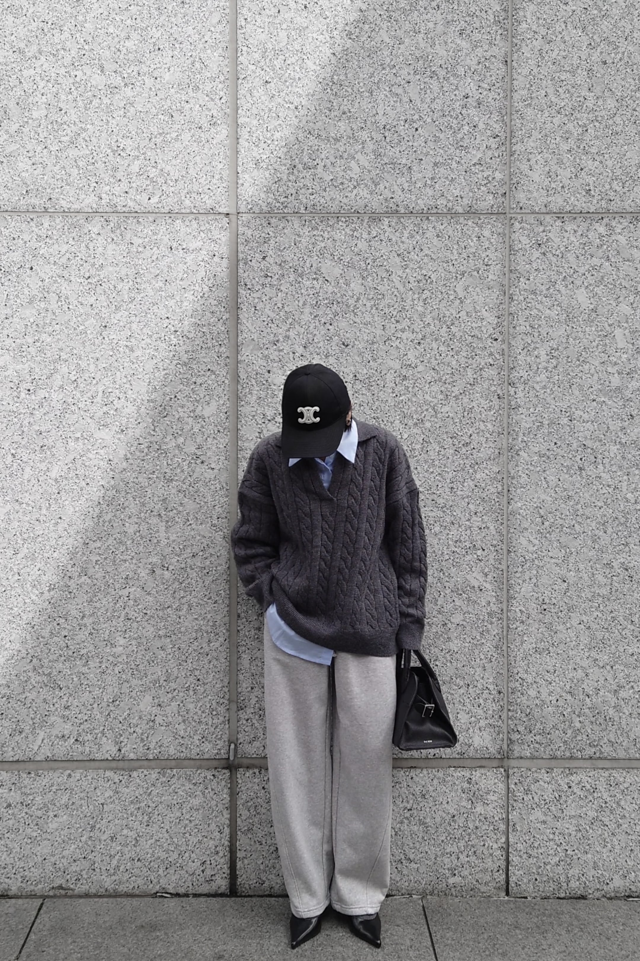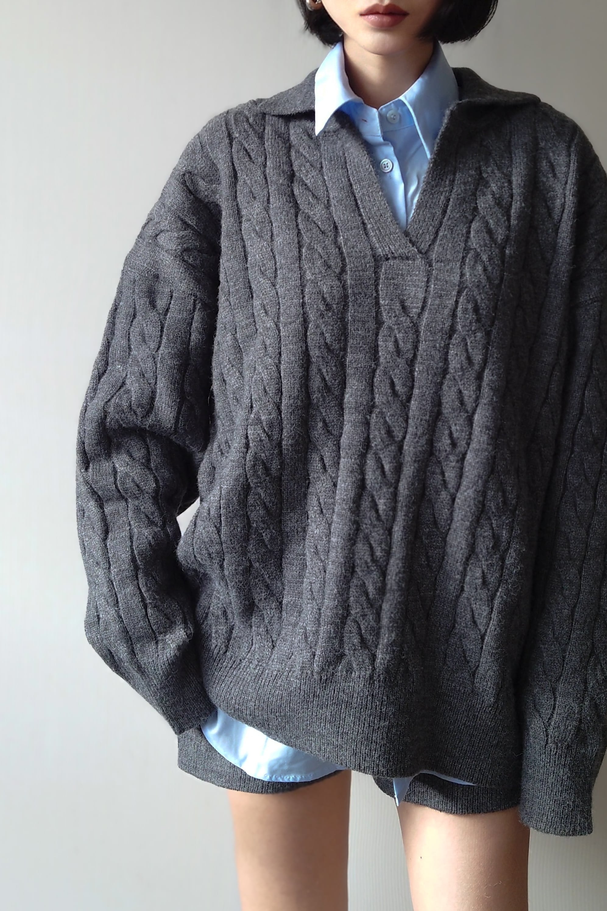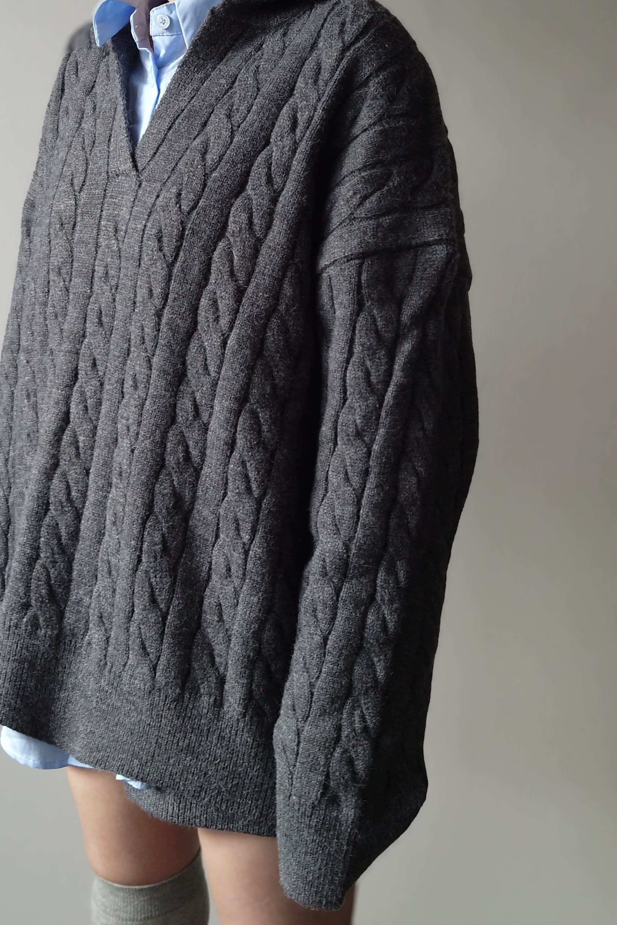 襟付きのケーブルニットは、ふんわりと柔らかい風合いで、